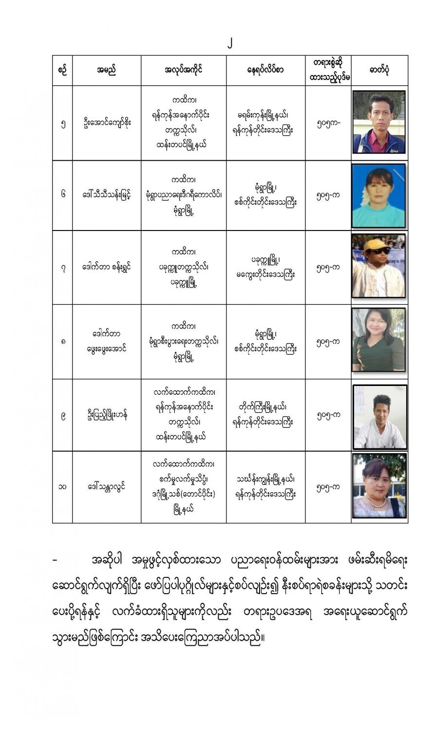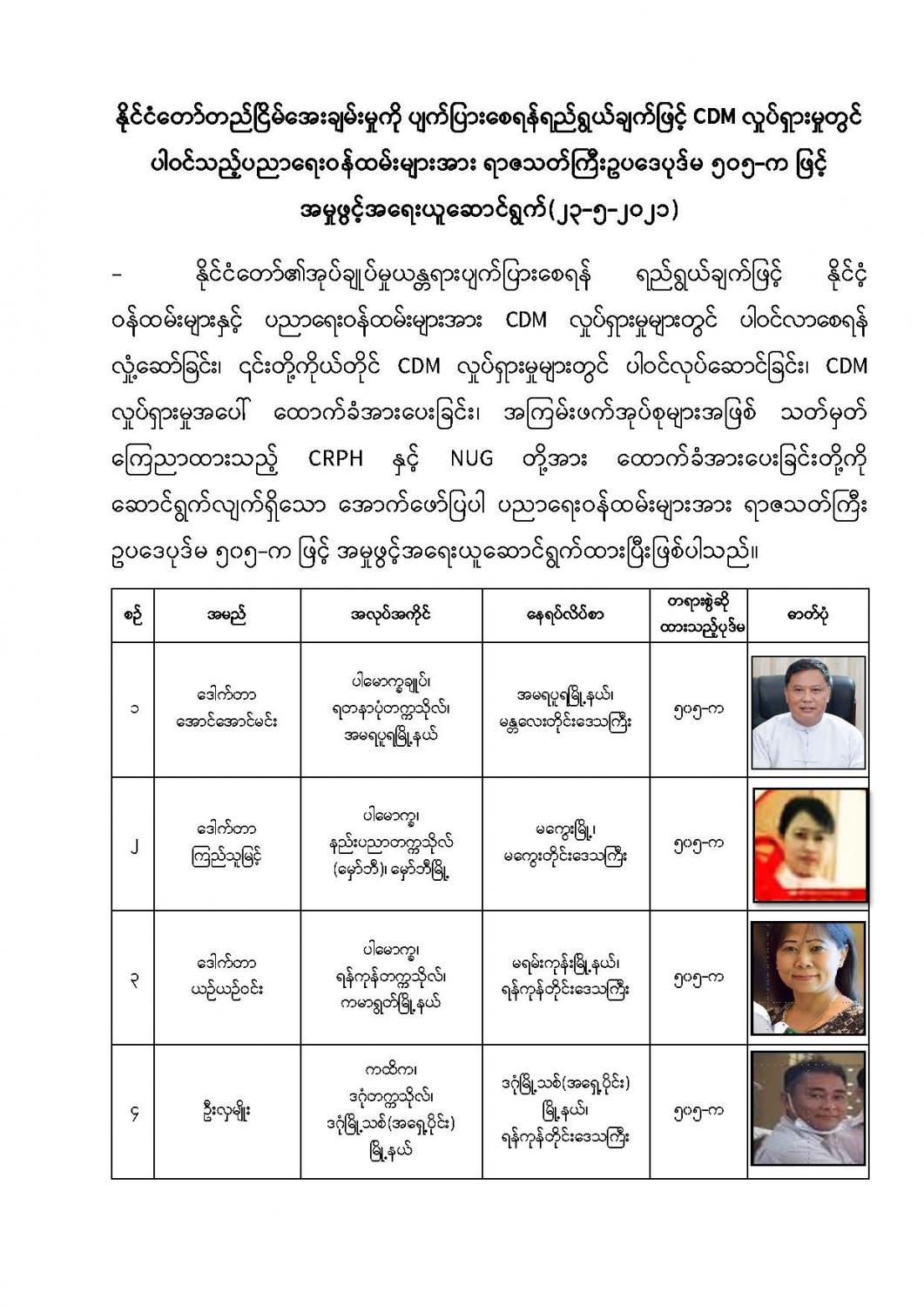 နိုင်ငံတော်တည်ငြိမ်အေးချမ်းမှုကို ပျက်ပြားစေရန်ရည်ရွယ်ချက်ဖြင့် CDM လှုပ်ရှားမှုတွင် ပါဝင်သည့်ပညာရေးဝန်ထမ်းများအား ရာဇသတ်ကြီးဥပဒေပုဒ်မ ၅၀၅-က ဖြင့် အမှုဖွင့်အရေးယူဆောင်ရွက်(၂၃-၅-၂၀၂၁)