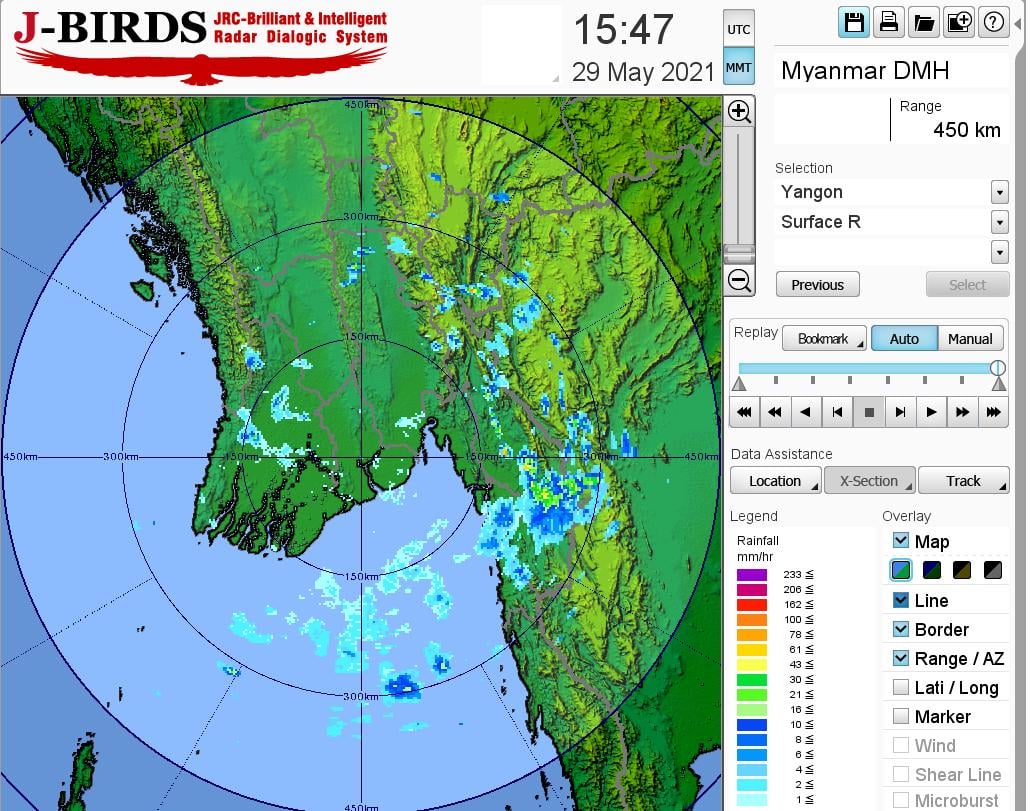 မိုးလေဝသနှင့် ဇလဗေဒညွှန်ကြားမှုဦးစီးဌာနမှ (၂၀၂၁ ခုနှစ်၊ မေလ (၂၉)ရက်နေ့ ညနေ(၄:၀၀) နာရီအချိန် ထုတ်ပြန်ချက်) ဘင်္ဂလားပင်လယ်အော် အခြေအနေ။ ကပ္ပလီပင်လယ်ပြင်၊ ဘင်္ဂလားပင်လယ်အော် တောင်ပိုင်းနှင့် အရှေ့အလယ်ပိုင်းတို့တွင် မုတ်သုံလေ အားအသင့်အတင့်မှ အားကောင်းနေပြီး၊ ကျန်ဘင်္ဂလားပင်လယ်အော်တွင် တိမ်အနည်းငယ် ဖြစ်ထွန်းနေပါသည်။ မနက်ဖြန်နံနက်အထိ ခန့်မှန်းချက်။ တနင်္သာရီတိုင်းဒေသကြီး၊ ကရင်ပြည်နယ်နှင့် မွန်ပြည်နယ် တို့တွင် နေရာအနှံ့အပြား၊ ပဲခူးတိုင်းဒေသကြီး၊ ရန်ကုန်တိုင်းဒေသကြီး၊ ဧရာဝတီတိုင်းဒေသကြီး၊ ရှမ်းပြည်နယ်(တောင်ပိုင်းနှင့် အရှေ့ပိုင်း)နှင့် ကယားပြည်နယ်တို့တွင် နေရာစိပ်စိပ်၊ နေပြည်တော်၊ မန္တလေးတိုင်းဒေသကြီး၊ ကချင်ပြည်နယ်နှင့် ချင်းပြည်နယ်တို့တွင် နေရာကျဲကျဲ နှင့် ကျန်တိုင်းဒေသကြီးနှင့် ပြည်နယ်တို့တွင် နေရာကွက်ကျား မိုးထစ်ချုန်းရွာပြီး၊ တနင်္သာရီ တိုင်းဒေသကြီးတွင် နေရာကွက်၍ မိုးကြီးနိုင်ပါသည်။ ရွာရန်ရာနှုန်း(၈၀) ဖြစ်ပါသည်။ မြန်မာ့ပင်လယ်ပြင်။ မြန်မာ့ကမ်းရိုးတန်း တစ်လျှောက်နှင့် ကမ်းလွန်ပင်လယ်ပြင်တို့တွင် တစ်ခါတစ်ရံ မိုးသက်လေပြင်းများကျရောက်ပြီး လှိုင်းအသင့်အတင့်မှ လှိုင်းကြီးနိုင်ပါသည်။ မိုးသက်လေပြင်းကျစဉ် ရေပြင်/မြေပြင်လေသည် တစ်နာရီလျှင် မိုင်(၃၀)မှ (၃၅)မိုင်အထိ တိုက်ခတ်နိုင်ပါသည်။ လှိုင်းအမြင့်မှာ မြန်မာ့ကမ်းရိုးတန်း တစ်လျှောက်နှင့် ကမ်းလွန် ပင်လယ်ပြင်တို့တွင် (၆)ပေမှ (၉)ပေခန့်ရှိနိုင်ပါသည်။ နောက်(၂)ရက်အတွက် ခန့်မှန်းချက်။ အနောက်တောင်မုတ်သုံလေသည် မြန်မာနိုင်ငံ အလယ်ပိုင်း ဒေသများသို့ ဝင်ရောက်နိုင်ပါသည်။ နေပြည်တော်နှင့် အနီးတစ်ဝိုက်အတွက် မနက်ဖြန်နံနက်အထိ ခန့်မှန်းချက်။ နေရာကွက်ကျား မိုးထစ်ချုန်းရွာမည်။ ရွာရန်ရာနှုန်း(၈၀) ဖြစ်ပါသည်။ ရန်ကုန်မြို့နှင့် အနီးတစ်ဝိုက်အတွက် မနက်ဖြန်နံနက်အထိ ခန့်မှန်းချက်။ မိုးတစ်ကြိမ်၊ နှစ်ကြိမ် ထစ်ချုန်းရွာမည်။ ရွာရန်ရာနှုန်းပြည့် ဖြစ်ပါသည်။ မန္တလေးမြို့နှင့် အနီးတစ်ဝိုက်အတွက် မနက်ဖြန်နံနက်အထိ ခန့်မှန်းချက်။ နေရာကွက်ကျား မိုးထစ်ချုန်းရွာနိုင်ပါသည်။ ရွာရန်ရာနှုန်း(၆၀) ဖြစ်ပါသည်။ #မိုးလေဝသနှင့် ဇလဗေဒညွှန်ကြားမှုဦးစီးဌာန