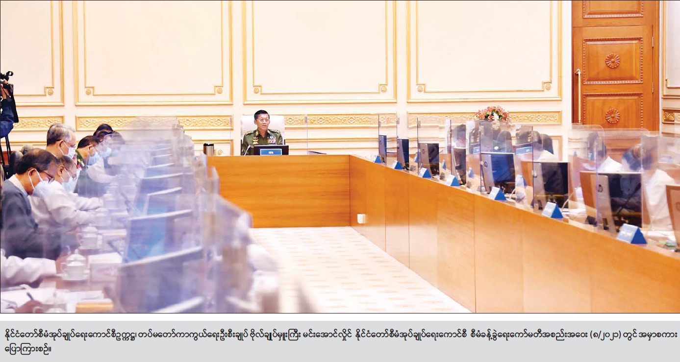 နိုင်ငံတော်စီမံအုပ်ချုပ်ရေးကောင်စီ စီမံခန့်ခွဲရေးကော်မတီ အစည်းအဝေး (၈/၂၀၂၁) ကို ယနေ့မွန်းလွဲပိုင်းတွင် နေပြည်တော်ရှိ နိုင်ငံတော်စီမံအုပ်ချုပ်ရေး ကောင်စီဥက္ကဋ္ဌရုံး အစည်းအဝေးခန်းမ၌ကျင်းပရာ နိုင်ငံတော်စီမံအုပ်ချုပ်ရေးကောင်စီ ဥက္ကဋ္ဌ၊ တပ်မတော်ကာကွယ်ရေးဦးစီးချုပ် ဗိုလ်ချုပ်မှူးကြီးမင်းအောင်လှိုင် တက်ရောက် အမှာစကား ပြောကြားသည်။