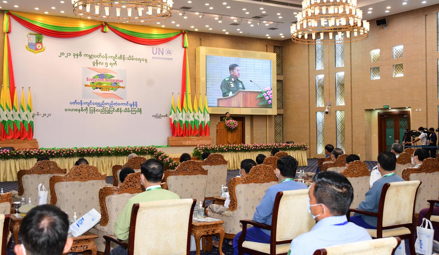 ဦးစွာ နိုင်ငံတော်စီမံအုပ်ချုပ်ရေးကောင်စီဥက္ကဋ္ဌ၊ တပ်မတော်ကာကွယ်ရေးဦးစီးချုပ် ဗိုလ်ချုပ်မှူးကြီး မင်းအောင်လှိုင်က အဖွင့်မိန့်ခွန်းပြောကြားရာတွင် ယနေ့ကျရောက် သည့် ၂၀၂၁ ခုနှစ် ကမ္ဘာ့ပတ်ဝန်းကျင် ထိန်းသိမ်းရေးနေ့၏ ဆောင်ပုဒ်အနေဖြင့် “ပတ်ဝန်းကျင် ရေရှည်တည်တံ့ ကောင်းမွန်ဖို့ ဂေဟစနစ်ကို ပြန်လည်ပြုပြင် ထိန်းသိမ်းကြပါစို့ (Ecosystem Restoration)” ဖြစ်ပါကြောင်း၊ လူသားများနှင့် သဘာဝအကြားဆက်စပ်မှုကို ပိုမိုသဟဇာတဖြစ်စေရန် ရည်ရွယ်ချက်နှင့် အလေးပေး ဖော်ညွှန်းထားသည့် ဆောင်ပုဒ်ဖြစ်ပါကြောင်း။