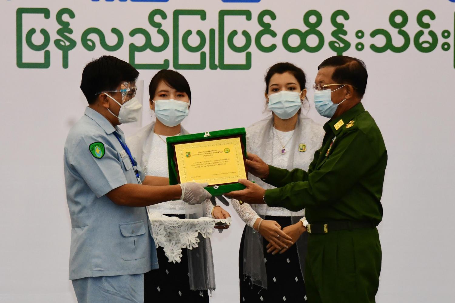 ဆက်လက်ပြီး နိုင်ငံတော်စီမံအုပ်ချုပ်ရေးကောင်စီဥက္ကဋ္ဌ၊ တပ်မတော်ကာကွယ် ရေး ဦးစီးချုပ် ဗိုလ်ချုပ်မှူးကြီး မင်းအောင်လှိုင် က ပတ်ဝန်းကျင်ဆိုင်ရာ စဉ်ဆက် မပြတ် ဖွံ့ဖြိုးသောမြို့ကြီးများအား ဆုများပေးအပ်ချီးမြှင့်ရာတွင် ပထမဆုရရှိသည့် ညောင်ဦးမြို့နယ် စည်ပင်သာယာရေးအဖွဲ့၊ ဒုတိယညွှန်ကြားရေးမှူး ဦးတင်မြင့်၊ ဒုတိယ ဆုရရှိသည့် ဝိုင်းမော်မြို့နယ်စည်ပင်သာယာရေးအဖွဲ့၊ ဒုတိယညွှန်ကြားရေးမှူး ဦးတင်မောင်ထွေး၊ တတိယဆုရရှိသည့် လွိုင်ကော်မြို့နယ် စည်ပင်သာယာရေးအဖွဲ့ ဒုတိယညွှန်ကြားရေးမှူး ဦးသန်းထွန်းတို့အား ဆုများအသီးသီးပေးအပ်ချီးမြှင့်သည်။