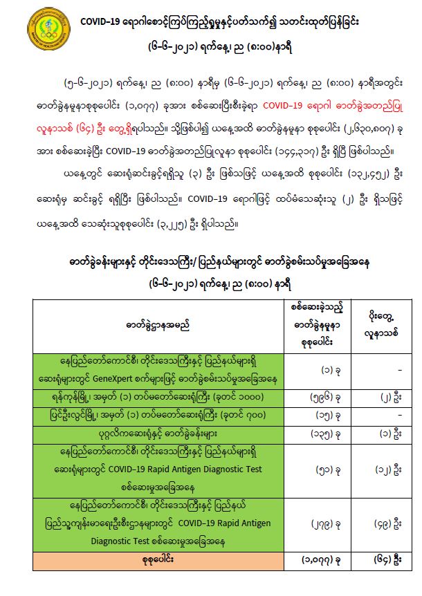 COVID-19 ရောဂါစောင့်ကြပ်ကြည့်ရှုမှုနှင့်ပတ်သက်၍ သတင်းထုတ်ပြန်ခြင်း (၆-၆-၂၀၂၁) ရက်နေ့၊ ည (၈:၀၀)နာရီ 06/06/2021