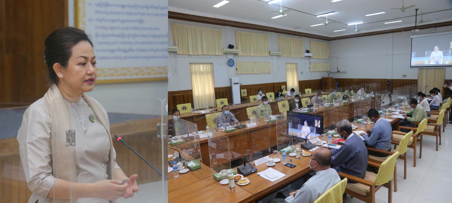 အစည်းအဝေးတွင် ပြည်ထောင်စုဝန်ကြီး ဒေါက်တာသက်သက်ခိုင်က ကျွမ်းကျင်သော လူမှုဝန်ထမ်းသမားများ မွေးထုတ်ပေးနိုင်ရေးအတွက် လူမှုရေးပညာတက္ကသိုလ်သည် မဖြစ်မ နေလိုအပ်ပါကြောင်း၊ လူမှုရေး ပညာ တက္ကသိုလ် ဖွင့်လှစ်နိုင်ရေးနှင့်စပ်လျဉ်း၍ မြေနေရာရရှိ နိုင်ရေးအတွက် ဝန်ကြီးဌာနအနေဖြင့် လိုအပ်သည်များ ညှိနှိုင်းဆောင်ရွက်ထားပါကြောင်း၊ မိတ်ဖက်နိုင်ငံများနှင့်လည်း လူမှုရေးပညာတက္ကသိုလ် ဖွင့်လှစ်နိုင်ရေးအတွက် ပူးပေါင်း ဆောင်ရွက်နိုင်ရန် ဆွေးနွေးထားသည်များရှိပါကြောင်း၊ သင်ရိုးညွှန်းတမ်းအတည်ပြုပြဌာန်း နိုင်ရေး ကြိုးပမ်း သွားရမည်ဖြစ်ကြောင်း၊ အခြေခံအဆောက်အအုံပိုင်းဆိုင်ရာ၊ ပညာရပ်ပိုင်းဆိုင် ရာနှင့် လူ့စွမ်းအား အရင်းအမြစ်ပိုင်းဆိုင်ရာ လိုအပ်ချက်များကို ဖြည့်ဆည်းနိုင်ရေးအတွက် အချိန်ယူဆောင်ရွက်ရန်လိုအပ်ကြောင်း၊ ဖွဲ့စည်း ထားသည့် ကော်မတီများ၊ ဆပ်ကော်မတီ များအနေဖြင့် ပေးအပ်သည့်တာဝန်များကို အဖွဲ့လိုက် ပူးပေါင်း ဆောင်ရွက်သွားစေလိုကြောင်း၊ တက်ရောက်လာကြသူများကလည်း ဝိုင်းဝန်းအကြံပြု ဆွေးနွေးပေးကြစေ လိုပါကြောင်း ပြောကြားသည်။
