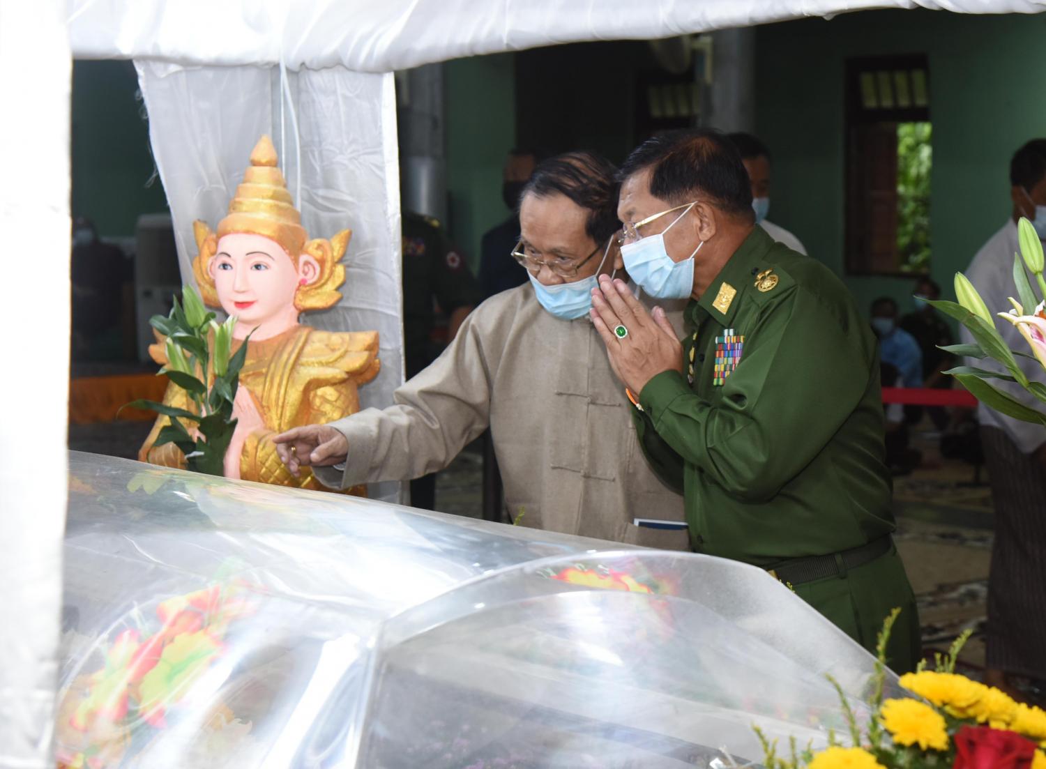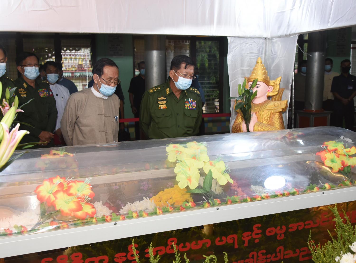 ဦးစွာ နိုင်ငံတော်စီမံအုပ်ချုပ်ရေးကောင်စီဥက္ကဋ္ဌ တပ်မတော်ကာကွယ်ရေးဦးစီးချုပ် ဗိုလ်ချုပ်မှူးကြီး မင်းအောင်လှိုင် သည် ဈေကုန်းကျောင်းတိုက် ရွှေရတုဗိမာန် စံကျောင်းတော်အတွင်း အပူဇော်ခံထားရှိသည့် ဈေးကုန်းဆရာတော်ဘုရားကြီး၏ ရုပ်ကလာပ်တော်အား ဂါရဝပြုဖူးမြော်သည်။