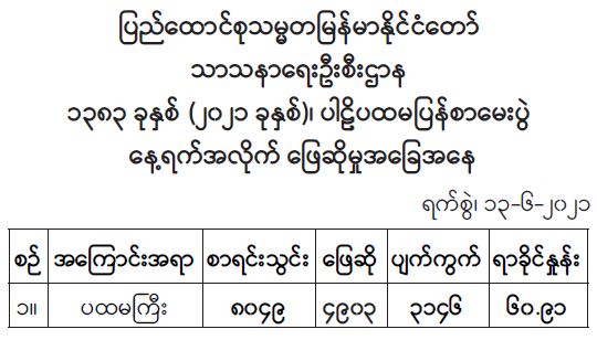 သာသနာရေးနှင့်ယဉ်ကျေးမှုဝန်ကြီးဌာန၊ သာသနာရေးဦးစီးဌာနကကြီးမှူး၍ နှစ်စဉ်ကျင်းပ ပြုလုပ်သော ၂၀၂၁ ခုနှစ် ပါဠိပထမပြန်စာမေးပွဲ (ပထမကြီး) သတ္တမနေ့ကို ဇွန် ၁၃ ရက်၌ နိုင်ငံ တစ်ဝန်းလုံးရှိ စာဖြေဌာန ၂၄၁ ဌာနတို့တွင် စာရင်းသွင်းသံဃာနှင့် သီလရှင် စုစုပေါင်း ၈၀၄၉ ပါး အနက် ၄၉၀၃ ပါး ဖြေဆိုကြသဖြင့် ၆၀ ဒဿမ ၉၁ ရာခိုင်နှုန်း ဖြေဆိုကြကြောင်း သာသနာရေး ဦးစီးဌာနမှ သိရသည်။