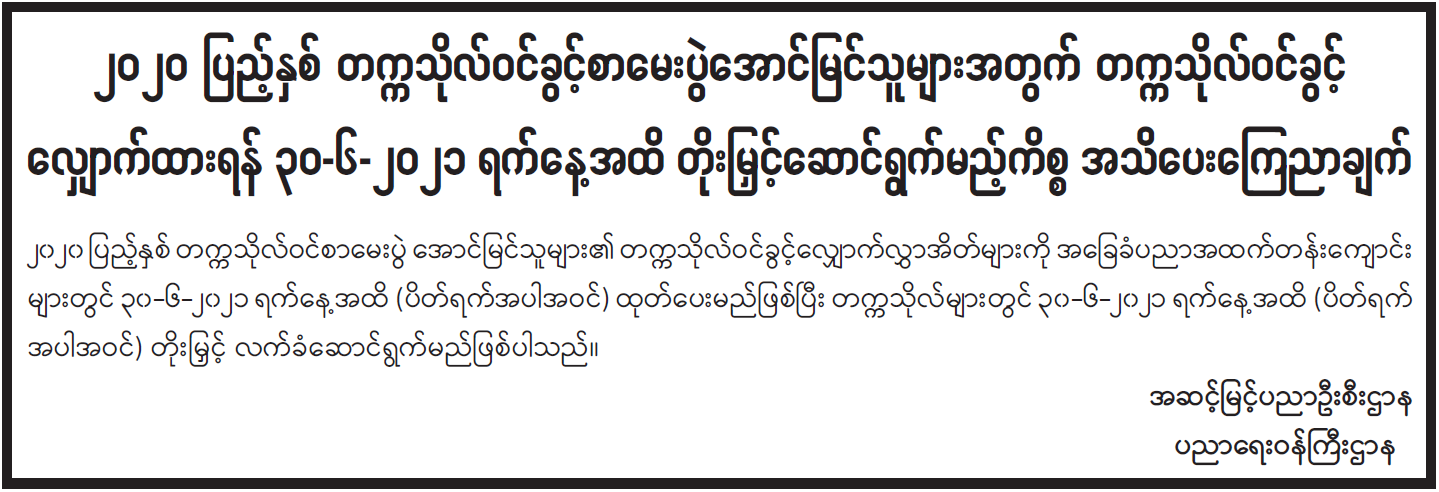 ၂၀၂၀ ပြည့်နှစ် တက္ကသိုလ်ဝင်ခွင့်စာမေးပွဲအောင်မြင်သူများအတွက် တက္ကသိုလ်ဝင်ခွင့် လျှောက်ထားရန် ၃၀-၆-၂၀၂၁ ရက်နေ့အထိ တိုးမြှင့်ဆောင်ရွက်မည့်ကိစ္စ အသိပေးကြေညာချက် 06/16/2021