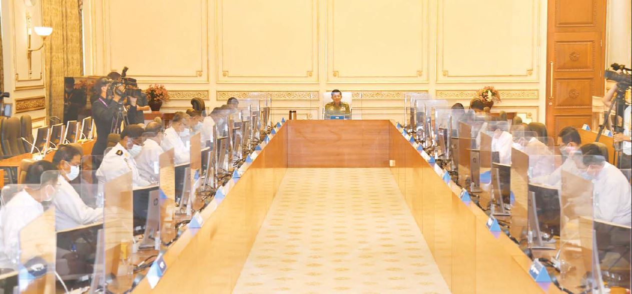 နိုင်ငံတော်စီမံအုပ်ချုပ်ရေးကောင်စီ စီမံခန့်ခွဲရေးကော်မတီ အစည်းအဝေး(၉/၂၀၂၁)ကို ယနေ့နံနက်ပိုင်းတွင် နေပြည်တော်ရှိ နိုင်ငံတော်စီမံအုပ်ချုပ်ရေးကောင်စီ ဥက္ကဋ္ဌရုံး အစည်းအဝေးခန်းမ၌ကျင်းပရာ နိုင်ငံတော်စီမံအုပ်ချုပ်ရေး ကောင်စီဥက္ကဋ္ဌ၊ တပ်မတော်ကာကွယ်ရေးဦးစီးချုပ် ဗိုလ်ချုပ်မှူးကြီးမင်းအောင်လှိုင် တက်ရောက် အမှာ စကား ပြောကြားသည်။