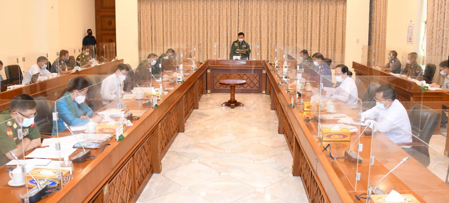 ယင်းနောက် ပြည်ထောင်စုဝန်ကြီးများဖြစ်ကြသည့် ဗိုလ်ချုပ်ကြီးမြထွန်းဦး၊ ဒုတိယဗိုလ်ချုပ်ကြီး ထွန်းထွန်းနောင်၊ ဗိုလ်ချုပ်ကြီးတင်အောင်စန်း၊ ဦးမြင့်ကြိုင်၊ ဒေါက်တာ သက်ခိုင်ဝင်း၊ ဒေါက်တာ သက်သက်ခိုင်၊ ဒုတိယဝန်ကြီး ဦးအေးထွန်းနှင့် ဗိုလ်မှူးချုပ် ကိုကိုလွင်တို့က ကမ္ဘာတွင် COVID-19 ရောဂါဖြစ်ပွားလျက်ရှိသည့် အခြေအနေများနှင့် ရောဂါဖြစ်ပွားမှု မြင့်တက်လျက်ရှိသည့် အခြေအနေများ၊ COVID-19 ရောဂါ ကာကွယ်၊ တားဆီး၊ ထိန်းချုပ်၊ ကုသရေးနှင့် အရေးပေါ်တုံ့ပြန်ရေး လုပ်ငန်းဆောင်ရွက် လျက်ရှိသည့် အခြေအနေများ၊ မြန်မာနိုင်ငံအတွင်း COVID-19 ရောဂါနှင့်စပ်လျဉ်း၍ အလျင်အမြန်တုံ့ပြန်ဆောင်ရွက်သင့်သည့် အခြေအနေများ၊ အလုပ်သမားများနှင့် စက်ရုံအလုပ်ရုံများတွင် COVID-19 ရောဂါ ကာကွယ်တားဆီးရေး လုပ်ငန်းဆောင်ရွက်လျှက်ရှိသည့်အခြေအနေများ၊ တိုင်းဒေသကြီးပြည်နယ်အလိုက် COVID-19 ရောဂါ ဓာတ်ခွဲ အတည်ပြုမှုအခြေအနေများ၊ မြန်မာနိုင်ငံတွင် COVID-19 ရောဂါအစုလိုက်ဖြစ်ပွားမှု အခြေအနေများ၊ အရေးပေါ်တုံ့ပြန်ရေးဆေးအဖွဲ့ ဖွဲ့စည်းဆောင်ရွက်လျက်ရှိသည့် အခြေ အနေများ၊ COVID-19 ဓာတ်ခွဲစစ်ဆေးခြင်းလုပ်ငန်း တိုးချဲ့ဆောင်ရွက်ခဲ့မှုများ၊ COVID-19 ရောဂါ ဓာတ်ခွဲစစ်ဆေးမှုနည်းပညာအလိုက် ရောဂါပိုးတွေ့ရှိမှု အခြေအနေများ၊ COVID-19 ရောဂါ ဖြစ်ပွားသည့်လူနာများအား ကုသမှုပေးခဲ့သည့် အစီအစဉ်များ၊ COVID-19 ရောဂါ ဖြစ်ပွားမှုအတွက် ပြင်ဆင် ဆောင်ရွက်ထားရှိမှုများ၊ အသွားအလာ ကန့်သတ်ထားရှိမှုများနှင့် ဆက်လက်ဆောင်ရွက်မည့် အခြေအနေများ၊ စေတနာဝန်ထမ်းများနှင့် ပူးပေါင်းဆောင်ရွက်မ များ၊ ကျန်းမာရေး အသိပညာမြှင့်တင်ရေး လုပ်ငန်းဆောင်ရွက်ထားရှိမှုများ၊ နယ်စပ် ဝင်၊ ထွက် ဂိတ်များတွင် ရောဂါစောင့်ကြပ်ကြည့်ရှုခြင်းလုပ်ငန်း ဆောင်ရွက်မှုများ၊ COVID-19 ရံပုံငွေရရှိမှုနှင့် သုံးစွဲမှုအခြေအနေ၊ နိုင်ငံတကာနှင့် ညှိနှိုင်းဆောင်ရွက်လျက်ရှိသည့် အခြေအနေများ၊ ကာကွယ်ဆေးထိုးနှံခြင်း၏ သက်ရောက်မှုများ၊ ရောဂါ ကာကွယ် ထိန်းချုပ်ရေးအထူး ဦးစားပေး ဆောင်ရွက်ရမည့် နေရာဒေသများနှင့်စပ်လျဉ်း၍ ရှင်းလင်းဆွေးနွေး အကြံပြုတင်ပြကြရာ နိုင်ငံတော်စီမံအုပ်ချုပ်ရေးကောင်စီ ဒုတိယဥက္ကဋ္ဌက ဖြည့်စွက်ဆွေးနွေး သည်။