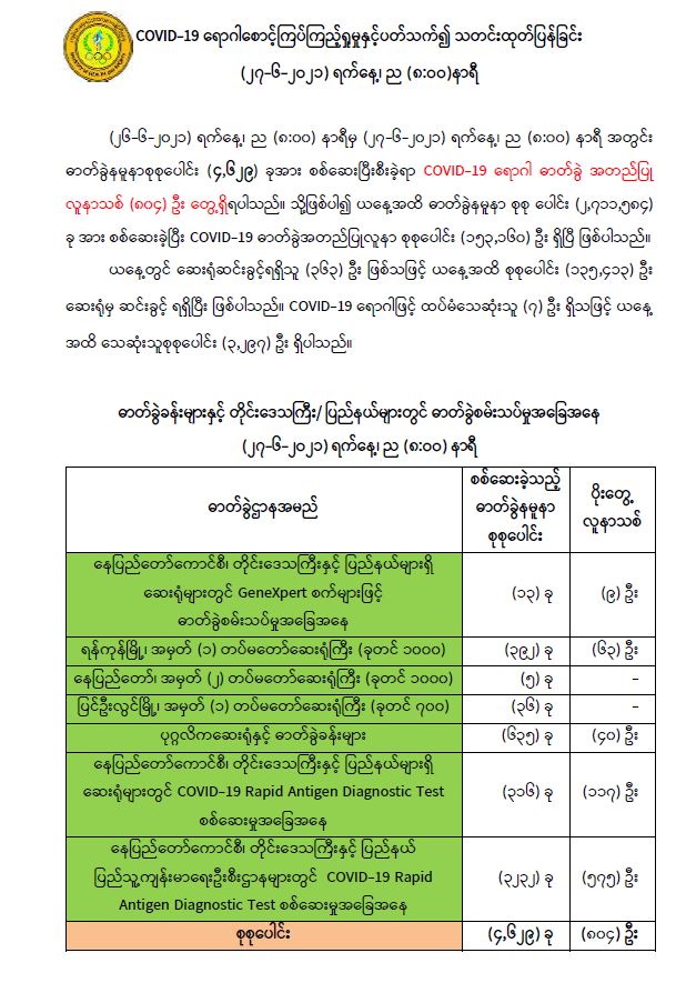 COVID-19 ရောဂါစောင့်ကြပ်ကြည့်ရှုမှုနှင့်ပတ်သက်၍ သတင်းထုတ်ပြန်ခြင်း (၂၇-၆-၂၀၂၁) ရက်နေ့၊ ည (၈:၀၀)နာရီ 06/27/2021