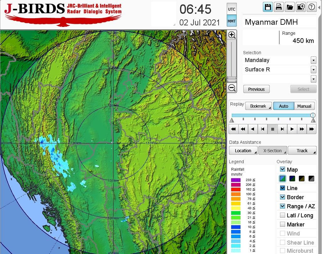 ယနေ့ညနေအထိခန့်မှန်းချက်။စစ်ကိုင်းတိုင်းဒေသကြီးအောက်ပိုင်း၊ မကွေးတိုင်းဒေသကြီးနှင့် ရှမ်းပြည်နယ်(မြောက်ပိုင်း)တို့တွင် နေရာကျဲကျဲ၊ စစ်ကိုင်းတိုင်းဒေသကြီးအထက်ပိုင်း၊ မန္တလေးတိုင်းဒေသကြီးနှင့် ကချင်ပြည်နယ်တို့တွင် နေရာစိပ်စိပ်နှင့် ကျန်တိုင်းဒေသကြီးနှင့် ပြည်နယ်တို့တွင် နေရာအနှံ့အပြား မိုးထစ်ချုန်းရွာပြီး၊ ရခိုင်ပြည်နယ်တွင် ဒေသအလိုက်နှင့် စစ်ကိုင်းတိုင်းဒေသကြီးအထက်ပိုင်း၊ ကချင်ပြည်နယ်၊ ကရင်ပြည်နယ်နှင့် မွန် နယ်ပြည်တို့တွင် နေရာကွက်၍ မိုးကြီးနိုင်ပါသည်။ ရွာရန်ရာနှုန်းပြည့် ဖြစ်ပါသည်။