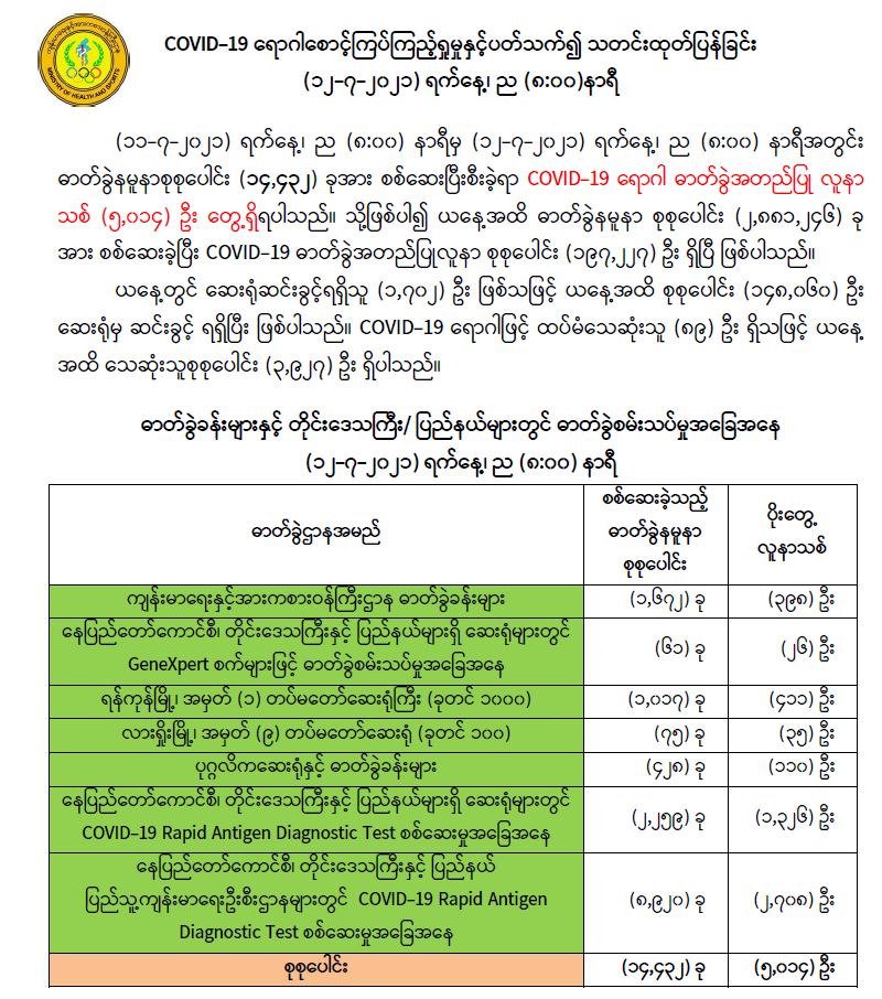 (၁၁-၇-၂၀၂၁) ရက်နေ့၊ ည (၈:၀၀) နာရီမှ (၁၂-၇-၂၀၂၁) ရက်နေ့၊ ည (၈:၀၀) နာရီအတွင်း ဓာတ်ခွဲနမူနာစုစုပေါင်း (၁၄,၄၃၂) ခုအား စစ်ဆေးပြီးစီးခဲ့ရာ COVID-19 ရောဂါ ဓာတ်ခွဲအတည်ပြု လူနာသစ် (၅,၀၁၄) ဦး တွေ့ရှိရပါသည်။ သို့ဖြစ်ပါ၍ ယနေ့အထိ ဓာတ်ခွဲနမူနာ စုစုပေါင်း (၂,၈၈၁,၂၄၆) ခု အား စစ်ဆေးခဲ့ပြီး COVID-19 ဓာတ်ခွဲအတည်ပြုလူနာ စုစုပေါင်း (၁၉၇,၂၂၇) ဦး ရှိပြီ ဖြစ်ပါသည်။