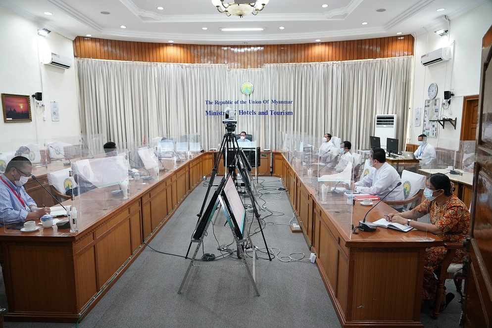 ကိုဗစ်-၁၉ အလွန်ကာလတွင် ခရီးသွားလုပ်ငန်း ရှင်သန်ရပ်တည်နိုင်ရေး အထောက် အကူပြု Application မိတ်ဆက်ရှင်းလင်းတင်ပြသည့် Skylark ကုမ္ပဏီ တာဝန်ရှိသူများနှင့် တွေ့ဆုံညှိနှိုင်း အစည်းအဝေးကို ယနေ့နံနက်ပိုင်းတွင် ဟိုတယ်နှင့်ခရီးသွားလာရေးဝန်ကြီး ဌာန နီလာအစည်းအဝေး ခန်းမ၌ ကျန်းမာရေးနှင့် အားကစားဝန်ကြီးဌာနမှ ထုတ်ပြန် ထားရှိသည့် ကိုဗစ်-၁၉ ရောဂါ ကာကွယ်၊ ထိန်းချုပ်ရေးဆိုင်ရာ ညွှန်ကြားချက်များနှင့်အညီ Social Distancing စနစ်ဖြင့် ကျင်းပသည်။