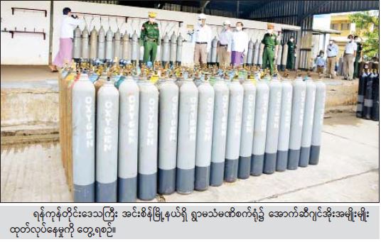 ကိုဗစ်-၁၉ ရောဂါ ကာကွယ်၊ ထိန်းချုပ်၊ ကုသရေးလုပ်ငန်းများတွင် အောက်ဆီဂျင် လိုအပ်ချက်များ ဖြစ်ပေါ်ခဲ့သဖြင့် အောက်ဆီဂျင် လိုအပ်ချက်များ ကို တစ်ဖက်တစ်လမ်းမှ အထောက်အကူပြုစေရန်အတွက် နိုင်ငံတော်နှင့် တပ်မတော်ပိုင် Oxygen Plant များ၊ ပုဂ္ဂလိကပိုင် Oxygen Plant များတွင် တိုးမြှင့်ထုတ်လုပ်နိုင်ရေး ကြိုးပမ်းဆောင်ရွက် လျက်ရှိသကဲ့သို့ စေတနာရှင်အလှူရှင်များမှ စုပေါင်းလှူဒါန်းငွေ များဖြင့်လည်း အောက်ဆီဂျင် နှင့် ဆက်စပ်ပစ္စည်း များကို ပြည်ပနိုင်ငံများမှ မှာယူတင်သွင်း ပေးလျက်ရှိပြီး လိုအပ် သည့်နေရာများ သို့ ပို့ဆောင်ဖြန့်ဝေပေးလျက်ရှိသည်။