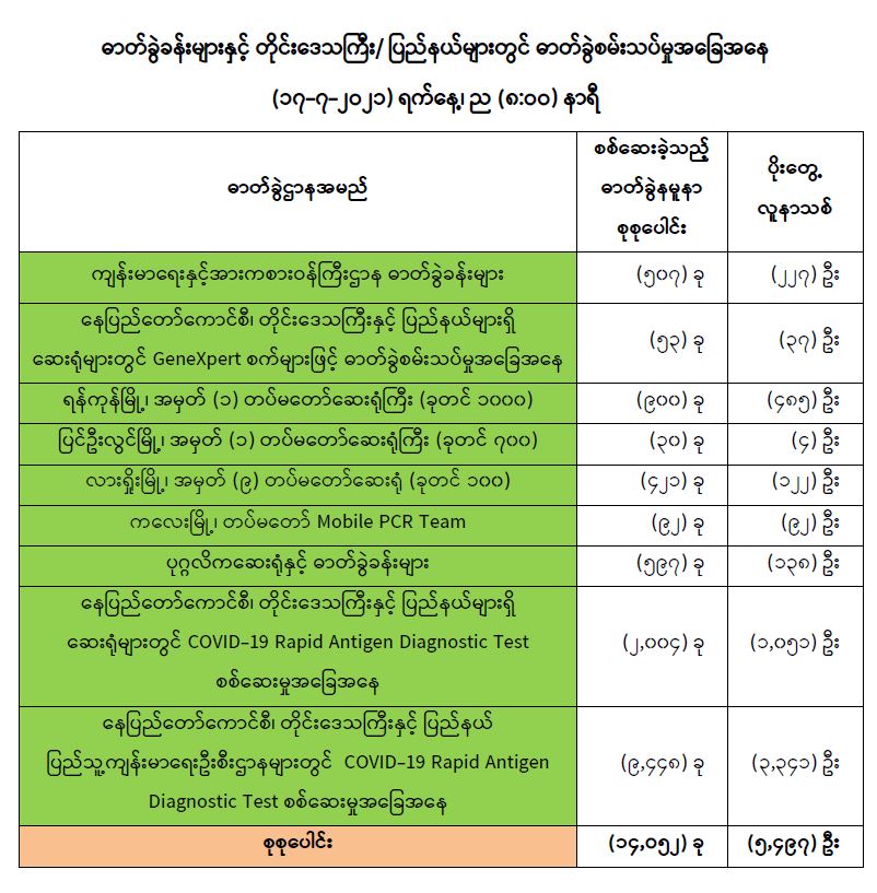 (၁၆--၂၀၂၁) ရက်နေ့၊ ည (:၀၀) နာရီမှ (၁-၇-၂၀၂၁) ရက်နေ့၊ ည (:၀၀) နာရီအတွင်း ဓာတ်ခွဲနမူနာစုစုပေါင်း (၁၄,၀၅၂) ခုအား စစ်ဆေးပြီးစီးခဲ့ရာ COVID-19 ရောဂါ ဓာတ်ခွဲ အတည်ပြု လူနာသစ် (၅,၄၉၇) ဦးတွေ့ရှိရပါသည်။ သို့ဖြစ်ပါ၍ ယနေ့အထိ ဓာတ်ခွဲနမူနာ စုစုပေါင်း (၂,၉၅၇,၅၁၄)ခု အား စစ်ဆေးခဲ့ပြီး COVID-19 ဓာတ်ခွဲအတည်ပြုလူနာ စုစုပေါင်း (၂၂၄,၂၃၆) ဦး ရှိပြီ ဖြစ်ပါသည်။
