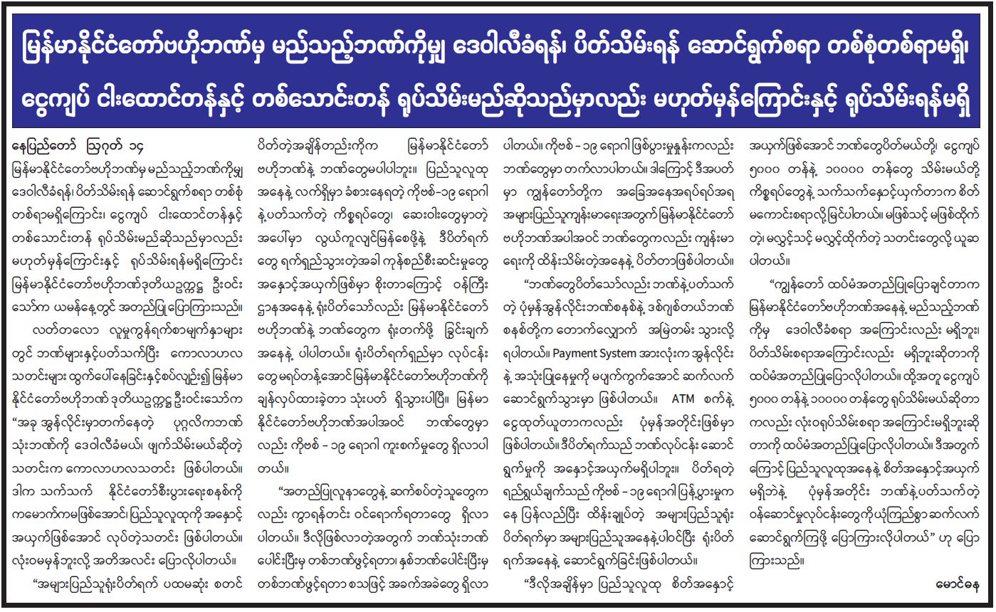 မြန်မာနိုင်ငံတော်ဗဟိုဘဏ်မှ မည်သည့်ဘဏ်ကိုမျှ ဒေဝါလီခံရန်၊ ပိတ်သိမ်းရန် ဆောင်ရွက်စရာ တစ်စုံတစ်ရာမရှိ၊ ငွေကျပ် ငါးထောင်တန်နှင့် တစ်သောင်းတန် ရုပ်သိမ်းမည်ဆိုသည်မှာလည်း မဟုတ်မှန်ကြောင်းနှင့် ရုပ်သိမ်းရန်မရှိ