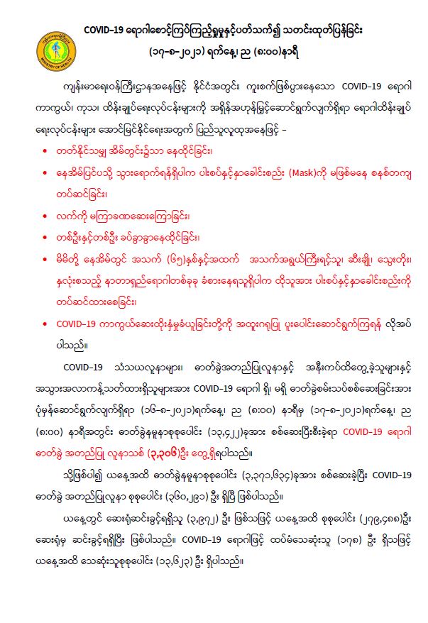 COVID-19 ရောဂါ စောင့်ကြပ်ကြည့်ရှုမှုနှင့် ပတ်သက်၍ သတင်းထုတ်ပြန်ခြင်း (၁၇-၈-၂၀၂၁) ရက်နေ့၊ ည (၈:၀၀)နာရီ