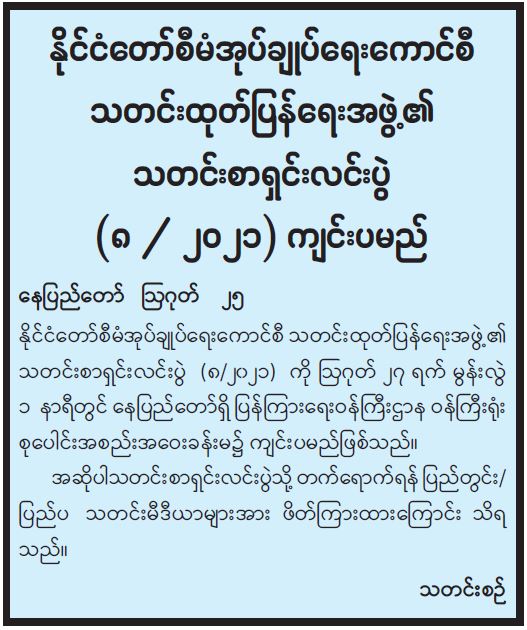 နိုင်ငံတော်စီမံအုပ်ချုပ်ရေးကောင်စီ သတင်းထုတ်ပြန်ရေးအဖွဲ့၏ သတင်းစာရှင်းလင်းပွဲ (၈/၂၀၂၁) ကျင်းပမည်
