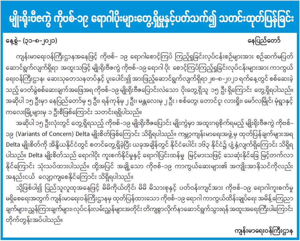 မျိုးရိုးဗီဇကွဲ ကိုဗစ်-၁၉ ရောဂါပိုးများ တွေ့ရှိမှုနှင့်ပတ်သက်၍ သတင်းထုတ်ပြန်ခြင်း