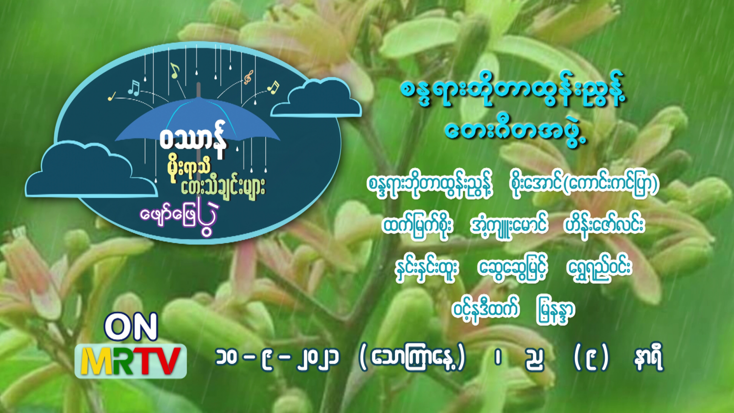 ဝဿာန်မိုးရာသီ တေးသီချင်းများ ဖျော်ဖြေပွဲ၏ ပွဲစဉ်(၁၅)ကို စက်တင်ဘာ(၁၀)ရက်၊ သောကြာနေ့ ည(၈)နာရီသတင်းအပြီးတွင် မြန်မာ့အသံနှင့် ရုပ်မြင်သံကြား၌ ထုတ်လွှင့် ပြသမည် ဖြစ်သည်။