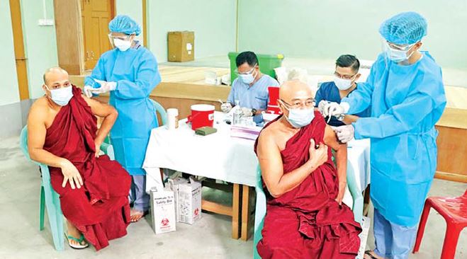ထိုသို့ ဆောင်ရွက်လျက်ရှိရာ ယနေ့တွင် ကချင်ပြည်နယ်၊ မြစ်ကြီးနားမြို့ရှိ ထေရ်ကြီးဝါကြီး ဆရာတော်ကြီးများ၊ ၆၅ နှစ်နှင့် အထက် သက်ကြီးဘိုးဘွားများ၊ ဌာန ဆိုင်ရာဝန်ထမ်းများနှင့် ပြည်သူ စုစုပေါင်း ၁၄၄၇ ဦးတို့အားလည်းကောင်း၊ ရှမ်းပြည်နယ် (မြောက်ပိုင်း)၊ နမ့်ဆန်မြို့နှင့် ကျောက်မဲမြို့များအတွင်းရှိ ထေရ်ကြီးဝါကြီး ဆရာတော် ကြီးများ၊ ၆၅ နှစ်နှင့်အထက် သက်ကြီးဘိုးဘွားများ၊ ဌာနဆိုင်ရာဝန်ထမ်းများနှင့် ပြည်သူစုစုပေါင်း ၉၅ ဦးတို့အား လည်းကောင်း၊ ရှမ်းပြည်နယ်(အရှေ့ပိုင်း)အတွင်းရှိ မြို့နယ်(၃)မြို့နယ်မှ ၆၅ နှစ်နှင့်အထက် သက်ကြီးဘိုးဘွားများ၊ ဌာနဆိုင်ရာဝန်ထမ်းများနှင့် ပြည်သူစုစုပေါင်း ၂၀၁၈ ဦးတို့အား လည်းကောင်း၊ တနင်္သာရီတိုင်းဒေသကြီး အတွင်းရှိ မြို့နယ်(၃)မြို့နယ်မှ ထေရ်ကြီးဝါကြီး ဆရာတော်ကြီးများ၊ ၆၅ နှစ်နှင့် အထက် သက်ကြီးဘိုးဘွားများ၊ ဌာနဆိုင်ရာဝန်ထမ်းများနှင့် ပြည်သူစုစုပေါင်း ၁၅၉၇ ဦးတို့အား လည်းကောင်း၊ ရန်ကုန်တိုင်းဒေသကြီးအတွင်းရှိ မြို့နယ် (၃)မြို့နယ်မှ ၆၅ နှစ်နှင့် အထက် သက်ကြီးဘိုးဘွားများ၊ ဌာနဆိုင်ရာဝန်ထမ်းများနှင့် ပြည်သူ စုစုပေါင်း ၇၅၉ ဦးတို့အားလည်းကောင်း၊ ဧရာဝတီတိုင်းဒေသကြီးအတွင်းရှိ မြို့နယ်(၁၁)မြို့ နယ်မှ သံဃာတော်များ၊ ၆၅ နှစ် နှင့်အထက် သက်ကြီးဘိုးဘွားများ၊ စေတနာ့ ဝန်ထမ်း များ၊ ဌာနဆိုင်ရာဝန်ထမ်းများနှင့် ပြည်သူစုစုပေါင်း ၅၇၅၅ ဦးတို့အား လည်းကောင်း၊ ရခိုင်ပြည်နယ်၊ စစ်တွေမြို့နယ်နှင့် ကျောက်ဖြူမြို့နယ်အတွင်းရှိ ကယ်ဆယ်ရေး စခန်းများမှ ဘင်္ဂါလီလူမျိုး ၁၁၅၅ ဦး၊ ရခိုင်ပြည်နယ်နှင့် ချင်းပြည်နယ် အတွင်းရှိ မြို့နယ်(၉)မြို့နယ်မှ သံဃာတော်များ၊ စေတနာ့ဝန်ထမ်းများ၊ ဌာနဆိုင်ရာဝန်ထမ်းများ၊ တိုက်ပွဲရှောင်ပြည်သူများနှင့် ဒေသခံပြည်သူ စုစုပေါင်း ၄၅၈၇ ဦးတို့အား လည်း ကောင်း၊ စစ်ကိုင်းတိုင်းဒေသကြီး၊ မုံရွာမြို့နယ်နှင့် ဆားလင်းကြီးမြို့နယ် အတွင်းရှိ သံဃာတော်များ၊ သာသနာနွယ်ဝင်သီလရှင်များ၊ ဌာနဆိုင်ရာ ဝန်ထမ်းများနှင့် ဒေသခံပြည်သူ စုစုပေါင်း ၂၈၃ ဦးတို့အားလည်းကောင်း၊ မန္တလေးတိုင်း ဒေသကြီးအတွင်းရှိ ခရိုင်(၇)ခု တို့မှ သံဃာတော်များ၊ ၆၅ နှစ်နှင့်အထက်သက်ကြီးဘိုးဘွားများ၊ ဌာနဆိုင်ရာဝန်ထမ်းများနှင့် ပြည်သူစုစုပေါင်း ၁၀၅၄၆ ဦးတို့အားလည်းကောင်း တပ်မတော်မှ ဆေးအဖွဲ့များက ပြည်သူ့ဆေးရုံများမှ ဆရာဝန်များ၊ သက်ဆိုင်ရာ ကျန်းမာရေးဝန်ထမ်းများ၊ စေတနာ့ဝန်ထမ်းများနှင့် ပူးပေါင်း၍ ကိုဗစ်- ၁၉ ရောဂါ ကာကွယ်ဆေးထိုးနှံပေးခြင်းများ ဆောင်ရွက်ပေးသည်။