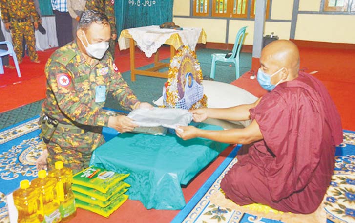 တပ်မတော် (ကြည်း၊ ရေ၊ လေ) အရာရှိ၊ စစ်သည်၊ အရာထမ်း၊ အမှုထမ်းများနှင့် စေတနာရှင် အလှူရှင်များက ကိုဗစ်-၁၉ ရောဂါ ကြိုတင်ကာကွယ်ရေးလုပ်ငန်းများ ဆောင်ရွက်နေသည့် ကာလအတွင်း ဆွမ်းကိစ္စရပ်များ အဆင်ပြေစေရန်ရည်ရွယ်၍ မြို့နယ် အသီးသီးရှိ ဘုန်းတော်ကြီး ကျောင်းများ၊ သာသနာနွယ်ဝင် သီလရှင်ကျောင်းများနှင့် ဘာသာရေးကျောင်းများတွင် ဆွမ်းဆန်တော်၊ ဆီ၊ ဆား၊ ပဲ အမယ်လေးမျိုးနှင့် လှူဖွယ်ပစ္စည်းများလှူဒါန်းခြင်း၊ နေ့ဆွမ်းများ ဆက်ကပ်လှူဒါန်းခြင်းနှင့် ကျန်းမာရေး စစ်ဆေးပေးခြင်းများကို ဆောင်ရွက်လျက်ရှိရာ စက်တင်ဘာ ၁၃ ရက်နှင့် ယနေ့တို့တွင် နေပြည်တော်ကောင်စီနယ်မြေ၊ ပျဉ်းမနား အရှေ့ခြမ်းတောင်ပေါ်ဒေသရှိ ပြဒါးချောင်း ကျေးရွာ ဘုန်းတော်ကြီးကျောင်း၊ ညောင်ပင်ကုန်း ဘုန်းတော်ကြီးကျောင်းနှင့် ဂမုန်းတောင်ဘုန်းတော်ကြီးကျောင်း၊ ပျဉ်းမနားမြို့နယ်၊ မင်္ဂလာဇေယျုံပါဠိတက္ကသိုလ် ကျောင်းတိုက်၊ မဟာလယ်တီစံ ကျောင်းတိုက်၊ ဝိပဿနာ ကျောင်းတိုက်၊ မူလသုဓမ္မာ မေဒနီသီလရှင်စာသင်တိုက်၊ ပုဗ္ဗသီရိမြို့နယ်၊ ဉာဏဂုဏ်ရည် စာသင်တိုက်၊ ကျောင်းစု ကျောင်းတိုက်နှင့် ကြာကန်ကျောင်းတိုက်၊ ရန်ကုန်တိုင်းဒေသကြီး၊ မှော်ဘီမြို့နယ်၊ ရဲစုကျေးရွာရှိ ရဲစုရွာဦး ကျောင်းတိုက်နှင့် လှည်းကူးမြို့နယ်၊ အင်းတိုင်ကျေးရွာရှိ စွန်းလွန်ဂူကျောင်းတိုက်၊ ဧရာဝတီတိုင်းဒေသကြီး၊ ကျောင်းကုန်းမြို့၊ ဒက္ခိဏာရာမ (ရွှေကျင်) ပရိယတ္တိစာသင်တိုက်၊ မန္တလေးတိုင်းဒေသကြီး၊ အောင်မြေသာစံမြို့နယ်၊ သစ်ဆိမ့်ကျောင်းတိုက် တို့ရှိ ဆရာတော်၊ သံဃာတော်များနှင့် သာသနာနွယ်ဝင် သီလရှင်များအတွက် ဆွမ်းဆန် တော်၊ ဆီ၊ ဆား၊ ပဲ အမယ်လေးမျိုး၊ ကိုဗစ်-၁၉ ရောဂါ ကာကွယ်ရေး အထောက်အကူပြု ပစ္စည်းများနှင့် လှူဖွယ်ပစ္စည်းများကို သက်ဆိုင်ရာ တိုင်းစစ်ဌာနချုပ်များမှ တိုင်းမှူးများနှင့် တာဝန်ရှိသူများက သွားရောက်ဆက်ကပ် လှူဒါန်းကြသည်။