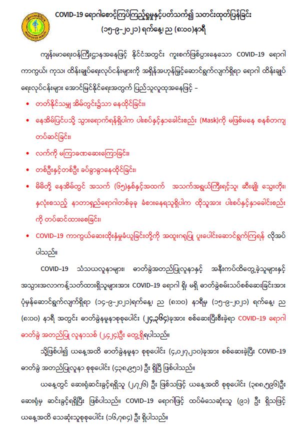 COVID-19 ရောဂါစောင့်ကြပ်ကြည့်ရှုမှုနှင့်ပတ်သက်၍သတင်းထုတ်ပြန်ခြင်း (၁၅-၉-၂၀၂၁) ရက်နေ့၊ ည (၈:၀၀)နာရီ 09/15/2021