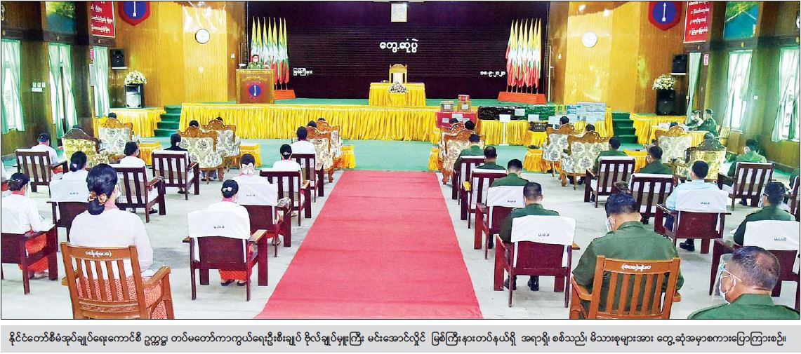 တပ်မတော်အနေဖြင့် နိုင်ငံတော်၏တာဝန်များကို ခေတ္တတာဝန်ယူ ဆောင်ရွက် နေရသည့်အချိန်တွင် နိုင်ငံတော်စီမံအုပ်ချုပ်ရေးကောင်စီကို ဖွဲ့စည်း၍ ရှေ့လုပ်ငန်းစဉ် ၅ ရပ်၊ ဦးတည်ချက် ၉ ရပ်ကို ချမှတ်ဆောင်ရွက်လျက်၍ နိုင်ငံတော်ဘက်စုံဖွံ့ဖြိုးတိုးတက် အောင်ကြိုးပမ်း လုပ်ဆောင်လျက် ရှိကြောင်း၊ လက်ရှိလုပ်ဆောင်နေမှုများသည် နိုင်ငံ့အရေးကိုလုပ်ဆောင်နေခြင်းဖြစ်ပြီး စစ်မှန်စည်းကမ်း ပြည့်ဝသည့် ပါတီစုံဒီမိုကရေစီစနစ် အပေါ်တွင် ခိုင်မာစွာ ရပ်တည်နိုင်ရေး၊ တိုင်းပြည်သာယာ ဝပြောရေးနှင့် စားရေ ရိက္ခာပေါ များစေရေးကို ဦးစားပေးလုပ်ဆောင်လျက်ရှိကြောင်း၊ ထိုသို့လုပ်ဆောင် နေစဉ် နိုင်ငံတော် အေးချမ်းသာယာမှုကို မလိုလားသူများက လမ်းပန်းဆက်သွယ် မှုပြတ်တောက်စေရေး၊ ပညာရေး၊ ကျန်းမာရေး၊ နိုင်ငံတော်အုပ်ချုပ်ရေး ယန္တရားများပျက်ပြားစေရေးအတွက် နည်းမျိုးစုံဖြင့် နှောင့်ယှက်ပြီး တိုင်းပြည်ဖျက်သည့် အဖျက်အမှောင့်လုပ်ရပ်များကို လုပ်ဆောင်လျက်ရှိသည်ကို တွေ့ရှိရမည်ဖြစ်ကြောင်း၊ မိမိတို့မြန်မာလူမျိုးများသည် လူမှုရေး စိတ်ဓာတ်ရှိကြပြီး စုပေါင်းလုပ် ဆောင်မှုကို တန်ဖိုးထားကြကြောင်း၊ ပြီးခဲ့သည့် ကာလများတွင် ထိုကဲ့သို့ ကောင်းမွန်သည့် စိတ်ဓာတ်များဖျက်ဆီးခံခဲ့ရကြောင်း၊ တိုင်းပြည်တွင်း ဖြစ်ပေါ်နေသည့် အဖျက်အမှောင့်လုပ်ရပ်များကို လုံခြုံရေးတပ်ဖွဲ့ဝင်များနှင့် ပြည်သူလူထုတို့ ပူးပေါင်း လက်တွဲ၍ ဝိုင်းဝန်းကာကွယ် တားဆီးရန်လိုအပ်မည်ဖြစ်ကာ အရာရှိ၊ စစ်သည်၊ မိသားစုများအနေဖြင့် ဖြစ်ပေါ်နေ သည့် နိုင်ငံရေးအခြေအနေများကို သိရှိနားလည်ရန် လိုအပ်ကြောင်း။