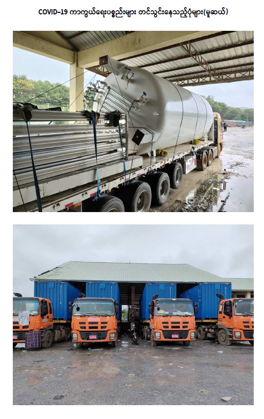 စီးပွားရေးနှင့် ကူးသန်းရောင်းဝယ်ရေးဝန်ကြီးဌာနအနေဖြင့် ကိုဗစ်-၁၉ ရောဂါကာကွယ်၊ ထိန်းချုပ်၊ ကုသရေးဆိုင်ရာ ပစ္စည်းများကို လေကြောင်း၊ ရေကြောင်းနှင့် နယ်စပ်ကုန်သွယ်ရေးစခန်းများမှ အဆင်ပြေချောမွေ့စွာ တင်သွင်းနိုင်ရေး အတွက် အချိန်နှင့်တပြေးညီ စီစဉ်ဆောင်ရွက်ပေး လျက်ရှိရာ ယနေ့တွင် ရန်ကုန်အပြည်ပြည်ဆိုင်ရာလေဆိပ်၊ ဆိပ်ကမ်း များနှင့် မူဆယ်၊ မြဝတီနှင့် ချင်းရွှေဟော် နယ်စပ်ကုန်သွယ်ရေးစခန်း(၃)ခုတို့မှ တင်သွင်းရာ၌ ကုမ္ပဏီ()ခုမှ ယာဉ်စီးရေ (၁၇)စီးဖြင့် အောက်ဆီဂျင်အရည် Browser ယာဉ်(၂)စီးဖြင့် တန်(၄၀)၊ အောက်ဆီဂျင် (အိုးခွံ) (၃၈၆၇) ခု၊ Oxygen Plant (၅၅)ခု၊ အိမ်သုံး Oxygen Concentrator (၁၈၀) ခုနှင့် နှာခေါင်းစည်း (Mask) (၂၄) တန် တင်သွင်းခဲ့သည်။ အောက်ဆီဂျင် အရည် Browser ယာဉ်(၂)စီးမှာ ရန်ကုန်မြို့သို့ ဖြစ်ပြီး Oxygen Plant (၅၅) ခုမှာ ဆိပ်ကမ်းမှ ရန်ကုန်မြို့သို့ အခု(၅၀) နှင့် မူဆယ်မှ ရန်ကုန်မြို့သို့(၃)ခု၊ သာစည်မြို့ သို့(၁)ခု၊ ချင်းရွှေဟော်မှ ပြင်ဦးလွင်မြို့သို့ (၁)ခုဖြစ်ကြောင်းသိရှိရသည်။