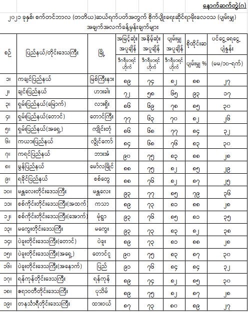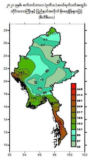 ၂၀၂၁ ခုနှစ်၊ စက်တင်ဘာလ (ဒုတိယ)ဆယ်ရက်ပတ်အတွင်း မိုးရွာသွန်းမှုအခြေအနေများမှာ- စစ်ကိုင်းတိုင်းဒေသကြီးအထက်ပိုင်း၊ ပဲခူးတိုင်းဒေသကြီး (အနောက်ပိုင်း)၊ ဧရာဝတီတိုင်းဒေသကြီး၊ တနင်္သာရီတိုင်းဒေသကြီး၊ ချင်းပြည်နယ်၊ ရှမ်းပြည်နယ်(မြောက်ပိုင်း)၊ ကရင်ပြည်နယ်နှင့် မွန်ပြည်နယ်တို့တွင် စက်တင်ဘာလ (ဒုတိယ)ဆယ်ရက်ပတ်၏ ပျမ်းမျှမိုးရေချိန်ခန့်သာရှိခဲ့ပြီး၊ စစ်ကိုင်း တိုင်းဒေသကြီးအောက်ပိုင်း၊ မန္တလေးတိုင်းဒေသကြီး၊ ပဲခူးတိုင်းဒေသကြီး(တောင်ပိုင်း)၊ ရန်ကုန် တိုင်းဒေသကြီးနှင့် ရခိုင်ပြည်နယ်တို့တွင် စက်တင်ဘာလ (ဒုတိယ) ဆယ်ရက်ပတ်၏ ပျမ်းမျှမိုးရေချိန် တို့ထက်ပိုခဲ့ကာ၊ မကွေးတိုင်းဒေသကြီး၊ ပဲခူးတိုင်းဒေသကြီး(အရှေ့ပိုင်း)၊ ကချင်ပြည်နယ်၊ ရှမ်းပြည်နယ် (အရှေ့ပိုင်းနှင့်တောင်ပိုင်း)နှင့် ကယားပြည်နယ်တို့တွင် စက်တင်ဘာလ (ဒုတိယ)ဆယ်ရက်ပတ်၏ ပျမ်းမျှ မိုးရေချိန်တို့အောက် လျော့နည်းခဲ့ပါသည်။