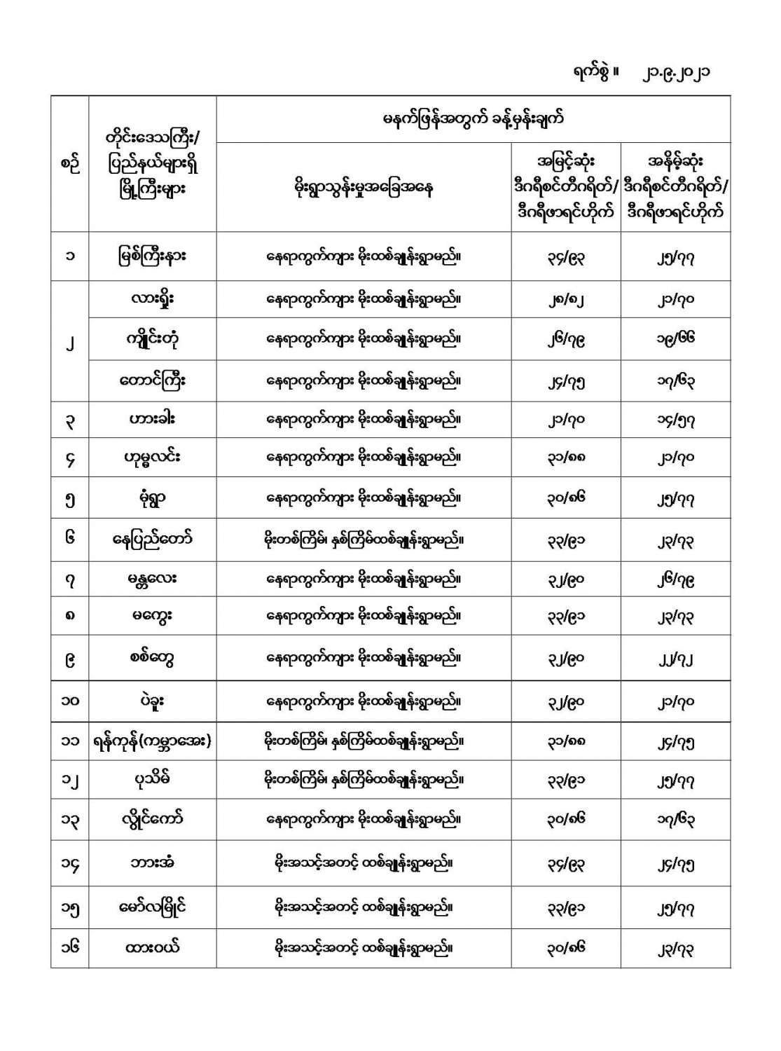 မနက်ဖြန်အတွက် တိုင်းဒေသကြီးနှင့် ပြည်နယ်များရှိ မြို့ကြီးများ၏ အမြင့်ဆုံးအပူချိန်၊ အနိမ့်ဆုံးအပူချိန်နှင့် မိုးလေဝသခန့်မှန်းချက် 09/21/2021 မနက်ဖြန်အတွက် တိုင်းဒေသကြီးနှင့် ပြည်နယ်များရှိ မြို့ကြီးများ၏ အမြင့်ဆုံးအပူချိန်၊ အနိမ့်ဆုံးအပူချိန်နှင့် မိုးလေဝသခန့်မှန်းချက် #မိုးလေဝသနှင့်ဇလဗေဒညွှန်ကြားမှုဦးစီးဌာန