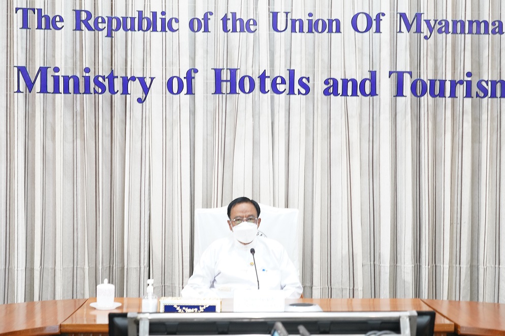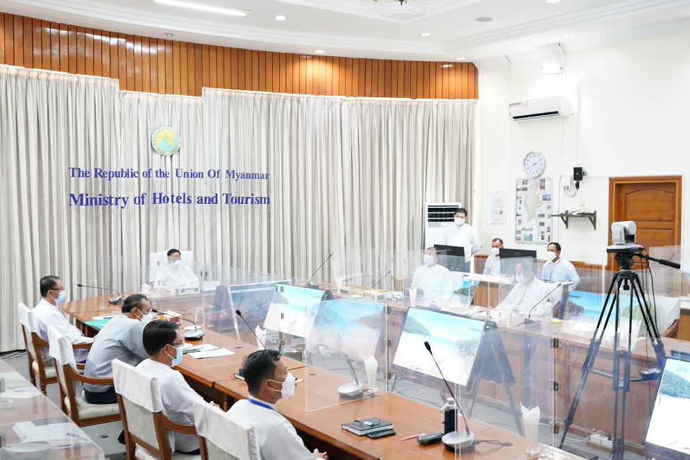 ဟိုတယ်နှင့်ခရီးသွားလာရေးဝန်ကြီးဌာန၊ ပြည်ထောင်စုဝန်ကြီး ဒေါက်တာဌေးအောင်သည် ကမ္ဘာ့ခရီးသွားလုပ်ငန်းနေ့ (၂၀၂၁) အထိမ်းအမှတ်အခမ်းအနား အောင်မြင်စွာကျင်းပနိုင်ရေး အပြီးသတ် စီစဉ်ဆောင်ရွက်ထားရှိမှုများနှင့်စပ်လျဉ်း၍ လုပ်ငန်းညှိနှိုင်း အစည်းအဝေးကို ယနေ့မွန်းလွဲပိုင်းက ဗီဒီယိုကွန်ဖရင့်စနစ်ဖြင့် ဝန်ကြီးဌာန နီလာအစည်းအဝေးခန်းမ၌ ကျန်းမာရေး ဝန်ကြီးဌာနမှ ထုတ်ပြန်ထားရှိသည့် ကိုဗစ်-၁၉ ရောဂါကာကွယ်၊ ထိန်းချုပ်ရေးဆိုင်ရာ ညွှန်ကြားချက်များနှင့်အညီ ကျင်းပသည်။