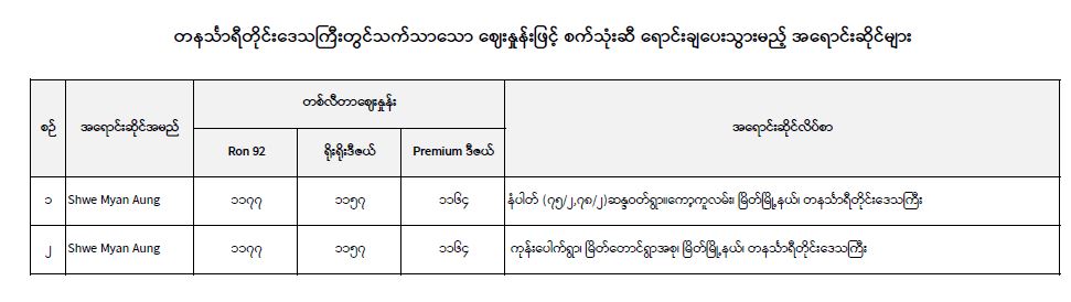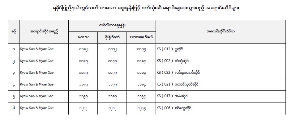 ထပ်မံ၍ ကျန်တိုင်းဒေသကြီး/ပြည်နယ်များတွင် သတ်မှတ်ဈေးနှုန်းဖြင့် ရောင်းချပေးနေသည့် စက်သုံးဆီဈေးနှုန်းနှင့် အရောင်းဆိုင်လိပ်စာတို့ကို ပြည်သူများ သိရှိဝယ်ယူနိုင်ရန် ထပ်မံဖော်ပြထားသည်။