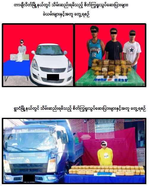 ဖြစ်စဉ်မှာ လုံခြုံရေးတပ်ဖွဲ့ဝင်များပါဝင်သော ပူးပေါင်းအဖွဲ့သည် စက်တင်ဘာ ၂၈ ရက် နံနက် ၆ နာရီ တာချီလိတ်မြို့နယ်၊ ဝှေလေလန်ပူးပေါင်းစစ်ဆေးရေးစခန်း၌ ဝမ်ပုံမှ တာချီလိတ်ဘက်သို့ အိုက်ခမ်း(ခ)အိုက်ကျင်(၃၅)နှစ် မောင်းနှင်လာသည့် Swift မော်တော်ယာဉ်ကို စစ်ဆေးရန် ရပ်တန့်ခိုင်းစဉ် မောင်နှင်ထွက်ပြေးသဖြင့် ပူးပေါင်းအဖွဲ့မှ ပိတ်ဆို့ရှာဖွေစစ်ဆေးခဲ့ရာ နံနက် ၈ နာရီ တွင် တာချီလိတ်မြို့နယ်၊ ဖန်မင်ကျေးရွာအုပ်စု၊ ပါဝုန်းကျေးရွာအတွင်း ပုန်းခိုနေသည့် အိုက်ခမ်း (ခ) အိုက်ကျင်ကို မော်တော်ယာဉ်နှင့်အတူတွေ့ရှိရပြီး ၎င်းသယ်ဆောင်လာသည့် ကျည်မျိုးစုံ ၁၅,၀၀၀ တောင့် သိမ်းဆည်းရမိခဲ့ကြောင်း၊ စစ်ဆေးဖော်ထုတ်ချက်အရ နံနက် ၁၁ နာရီတွင် တာချီလိတ်မြို့၊ ဆေခမ်းရပ်ကွက်၊ ဝမ်လုံနယ်မြေ၊ အိမ်အမှတ်(၇၇)ရှိ အိုက်စိုင်း(ခ) စိုင်းပေါင်း (၃၀) နှစ်၏ နေအိမ်ကို ဝင်ရောက်ရှာဖွေရာ ၎င်းနှင့်အတူ စိုင်းစိုင်း(၃၀)နှစ်၊ အားဝေ(၂၁) နှစ်တို့အား ဒေသကာလ တန်ဖိုးငွေကျပ်သိန်း ၁,၅၀၀ ကျော်တန်ဖိုးရှိ စိတ်ကြွရူးသွပ်ဆေးပြား ၃၀၉,၅၀၀ ဖမ်းဆီးရမိခဲ့ကြောင်း၊ အလားတူ မူးယစ်ဆေးဝါး တားဆီးနှိမ်နင်းရေးရဲတပ်ဖွဲ့မှ တပ်ဖွဲ့ဝင်များပါဝင်သောပူးပေါင်းအဖွဲ့သည် စက်တင်ဘာ ၂၉ ရက် ည ၈ နာရီ ရှမ်းပြည်နယ်(တောင်ပိုင်း)၊ ရွာငံမြို့နယ်၊ ကျောက်ဂူပြင် ကျေးရွာ အနီးတွင် မိုင်းရှူး မြို့နယ်မှ ရန်ကုန်တိုင်းဒေသကြီး၊ ထောက်ကြံ့မြို့နယ်သို့ အောင်လင်းကျော် (၂၇)နှစ် မောင်းနှင် လာသည့် SINO TRUK မော်တော်ယာဉ်ကို သတင်းအရရှာဖွေရာ အဆိုပါယာဉ်ပေါ်မှ ဒေသ ကာလတန်ဖိုးငွေကျပ်သိန်း ၄,၇၀၀ ကျော်တန်ဖိုးရှိ စိတ်ကြွရူးသွပ်ဆေးပြား ၉ ဒသမ ၅ သိန်း သိမ်းဆည်းရမိခဲ့သဖြင့် ၎င်းတို့ကို ဉပဒေအရအရေးယူထားရှိပြီး ကွင်းဆက်ပြစ်မှု ကျူးလွန်သူ များအား ဆက်လက်စစ်ဆေး ဖော်ထုတ်လျက်ရှိကြောင်း သိရသည်။
