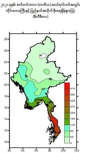 မိုးအခြေအနေ--မိုးရွာသွန်းမှုအခြေအနေမှာ- ရှမ်းပြည်နယ်(အရှေ့ပိုင်းနှင့်တောင်ပိုင်း)နှင့် ကယားပြည်နယ်တို့တွင် ရွာသွန်းမြဲ ထက်ပိုနိုင်ပြီး၊ ဧရာဝတီတိုင်းဒေသကြီး၊ ချင်းပြည်နယ်နှင့် ရခိုင်ပြည်နယ်တို့တွင် ရွာသွန်းမြဲအောက်လျော့နည်းနိုင်ကာ၊ နေပြည်တော်၊ စစ်ကိုင်းတိုင်းဒေသကြီး၊ မန္တလေးတိုင်းဒေသကြီး၊ မကွေးတိုင်းဒေသကြီး၊ ပဲခူးတိုင်းဒေသကြီး၊ ရန်ကုန်တိုင်းဒေသကြီး၊ တနင်္သာရီတိုင်းဒေသကြီး၊ ကချင်ပြည်နယ်၊ ရှမ်းပြည်နယ်(မြောက်ပိုင်း)၊ ကရင်ပြည်နယ်နှင့် မွန်ပြည်နယ်တို့တွင် ရွာသွန်း မြဲခန့် မိုးထစ်ချုန်းရွာနိုင်ပါသည်။