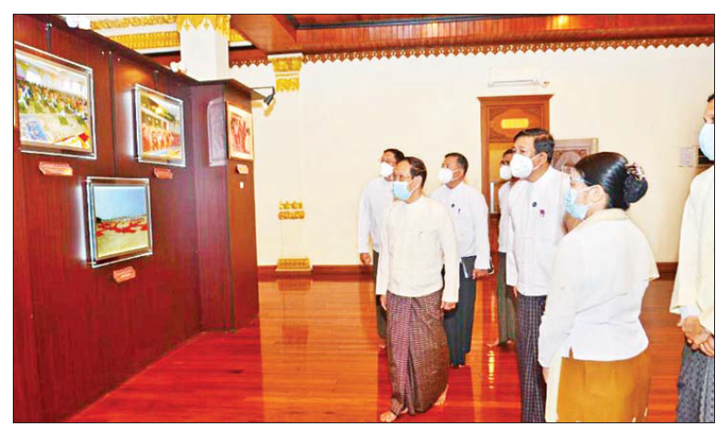 ရှေးဦးစွာ ပြည်ထောင်စုဝန်ကြီးသည် ပြတိုက်အတွင်း ခင်းကျင်းပြသထားသော ဥပ္ပါတသန္တိစေတီ တော်မြတ်ကြီး တည်ထားစဉ်က ဆောင်ရွက်ခဲ့သည့် အခမ်းအနား(၉)မျိုး ကျင်းပခြင်း မှတ်တမ်းဓာတ်ပုံ ကားချပ်များ၊ အိန္ဒိယနိုင်ငံ၊ သံဝေဇနိယလေးဌာနရှိ ဖွား၊ ပွင့်၊ ဟော၊ စံ ဓာတ်ပုံကားချပ်များကို Light | Box များဖြင့် ခင်းကျင်းပြသထားမှုနှင့် ဥပ္ပါတသန္တိစေတီတော် ပုံစံငယ်(၂)ဆူ၊ ရဟန္တာဓာတ်တော်ကြုတ်၊ မုဒြာပုံစံတို့ကို ခင်းကျင်းပြသထားမှုများကို လည်း