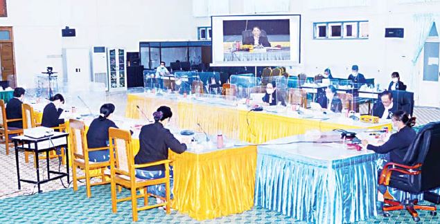 နိုင်ငံတော်စီမံအုပ်ချုပ်ရေးကောင်စီက မတ် ၂ ရက်တွင် အမိန့်ကြော်ငြာစာ အမှတ် ၅၁/၂၀၂၁ ဖြင့် ဥပဒေဘာသာပြန်ကော်မရှင်ကို ပြင်ဆင်ဖွဲ့စည်းခဲ့ပြီး ပြည်ထောင်စုရှေ့နေချုပ် ဒေါက်တာသီတာဦး ကို ဥက္ကဋ္ဌအဖြစ် လည်းကောင်း၊ ဥပဒေပညာရှင်များ၊ ဘာသာရပ်ဆိုင်ရာ ကျွမ်းကျင်ပညာရှင်များကို အဖွဲ့ဝင်အဖြစ်လည်းကောင်း ပါဝင်စေပြီး စုစုပေါင်း ၁၅ ဦးဖြင့် ဖွဲ့စည်းခဲ့ကြောင်း၊ ကော်မရှင်အနေဖြင့် ယခုအစည်းအဝေးကို ဩဂုတ်လတွင် ကျင်းပရန် စီစဉ်ထားခဲ့သော်လည်း ကိုဗစ်-၁၉ ရောဂါ ဖြစ်ပွားမှု အခြေအနေအရ ကျင်းပနိုင်ခြင်း မရှိခဲ့ကြောင်း၊ ဘာသာပြန်လုပ်ငန်းများကို အရှိန်အဟုန်မပျက် ထိရောက်စွာ ဆောင်ရွက်နိုင်ရန် ရည်ရွယ်လျက် Video Conferencing စနစ်ဖြင့် အစည်းအဝေးကျင်း ပြုလုပ်ရခြင်းဖြစ်ကြောင်း၊ မေ၂၀-ရက်နှင့် ၂၁ ရက် တို့တွင် ကော်မရှင်၏ အဋ္ဌမအကြိမ်အစည်းအဝေးသို့ ကော်မရှင်အဖွဲ့ဝင်များအားလုံး ကိုယ်တိုင်တက်ရောက်နိုင်ခဲ့သဖြင့် The Land Customs နှင့် The Negotiable Instruments Act တို့ကို ဆွေးနွေးနိုင်ခဲ့ကြောင်း၊ မိမိအနေဖြင့် ဥပဒေဘာသာပြန် ကော်မရှင်ဥက္ကဋ္ဌအဖြစ် တာဝန်ယူပြီးနောက် ကော်မရှင်အဖွဲ့ဝင်များနှင့် ယခုဒုတိယအကြိမ်တွေ့ဆုံ ဆွေးနွေးသည့် အစည်းအဝေးဖြစ်ပါကြောင်း၊ ၁၆၉-၂၀၂၁ ရက်နေ့က The Penal Code ၏ မြန်မာဘာသာပြန်ဆိုချက်ကို ကော်မရှင်၏ အမိန့်အမှတ် ၇/၂၀၂၁ ဖြင့် အတည်ပြုထုတ်ပြန်နိုင်ခဲ့ပြီး စာအုပ်အမှတ် (၉)အဖြစ် ထုတ်ဝေရန် ပြန်ကြားရေးဝန်ကြီး ဌာနသို့ ပေးပို့ပြီးဖြစ်ပါကြောင်း။