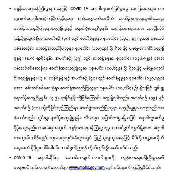 ကျန်းမာရေးဝန်ကြီးဌာနအနေဖြင့် နိုင်ငံအတွင်း ကူးစက်ဖြစ်ပွားနေသော COVID-19 ရောဂါ ကာကွယ်၊ ကုသ၊ ထိန်းချုပ်ရေး လုပ်ငန်းများကို အရှိန်အဟုန်မြှင့် ဆောင်ရွက်လျက်ရှိရာ ရောဂါ ထိန်းချုပ်ရေးလုပ်ငန်းများ အောင်မြင်နိုင်ရေးအတွက် ပြည်သူလူထု အနေဖြင့် ကျန်းမာရေး ဝန်ကြီးဌာနမှ ထုတ်ပြန်ထားသော COVID-19 ရောဂါ ကာကွယ် ထိန်းချုပ်ရေးဆိုင်ရာ စည်းကမ်းများကို စနစ်တကျ လိုက်နာဆောင်ရွက်ရန်လိုအပ်ပြီး COVID-19 ကာကွယ်ဆေး ထိုးနှံမှု ခံယူခြင်းအား အထူးဂရုပြု ပူးပေါင်းဆောင်ရွက် ကြရန် လိုအပ်ပါသည်။
