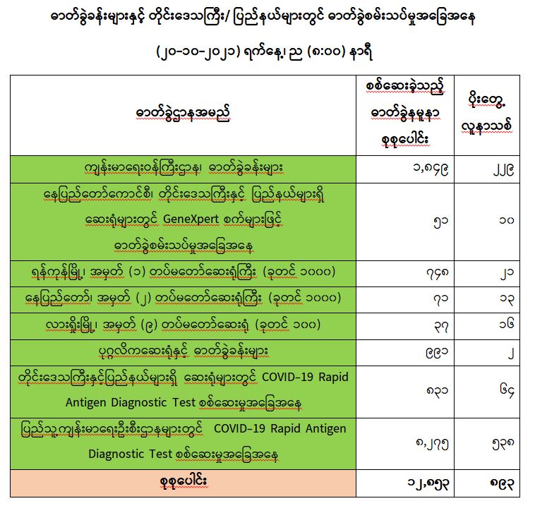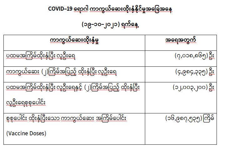 COVID-19 ရောဂါ ကာကွယ်ထိန်းချုပ်ရေးအတွက် တိုင်းဒေသကြီး/ပြည်နယ်များတွင် COVID-19 ရောဂါကာကွယ်ဆေးကို ဦးတည်အုပ်စုများသတ်မှတ်၍ ထိုးနှံပေးလျက်ရှိရာ (၁၉-၁၀-၂၀၂၁) ရက် နေ့အထိ လူဦးရေ စုစုပေါင်း (၁၂,၀၀၃,၂၀၀) ဦးအား ထိုးနှံပေးပြီးဖြစ်၍ ကာကွယ်ဆေးနှစ်ကြိမ် အပြည့် ထိုးနှံပြီးစီးသူ (4,၉၈၄,၃၃၅) ဦး နှင့် ပထမအကြိမ်ထိုးနှံပြီးစီးသူ (၇,၀၁၈,၈၆၅) ဦး ရှိပြီဖြစ် ပါသည်။ သို့ဖြစ်ပါ၍ (၁၉-၁၀-၂၀၂၁) ရက်နေ့အထိ မြန်မာနိုင်ငံတွင် COVID-19 ရောဂါကာကွယ် ဆေးအကြိမ်ရေ စုစုပေါင်း (16,987,535) ကြိမ် ထိုးနှံပြီး ဖြစ်ပါသည်။