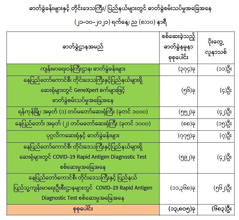 သို့ဖြစ်ပါ၍ ယနေ့အထိ ဓာတ်ခွဲနမူနာစုစုပေါင်း (၄,၆၈၇,၉၁၄) ခုအား စစ်ဆေးခဲ့ပြီး COVID-19 ဓာတ်ခွဲအတည်ပြုလူနာ စုစုပေါင်း (၄၉၁,၅၈၄) ဦး ရှိပြီ ဖြစ်ပါသည်။