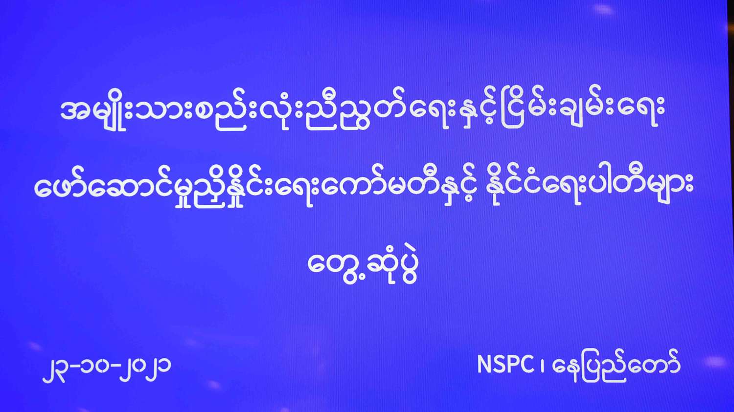 အမျိုးသားစည်းလုံးညီညွတ်ရေးနှင့် ငြိမ်းချမ်းရေးဖော်ဆောင်မှု ညှိနှိုင်းရေးကော်မတီ (NSPC) နှင့် နိုင်ငံရေးပါတီများ တွေ့ဆုံ ဆွေးနွေးပွဲကို ယနေ့နံနက်ပိုင်းက နေပြည်တော်ရှိ အမျိုးသား စည်းလုံးညီညွတ်ရေးနှင့် ငြိမ်းချမ်းရေးဖော်ဆောင်မှုဗဟိုဌာန အစည်းအဝေးခန်းမ၌ကျင်းပသည်။