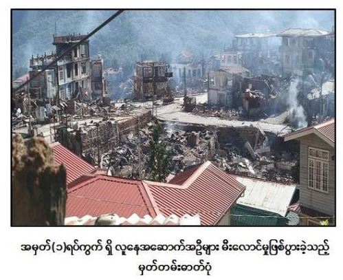 လုံခြုံရေးတပ်ဖွဲ့ဝင်များအနေဖြင့် မီးငြိမ်းသတ်ရေးလုပ်ငန်းများကို ဆောင်ရွက်ရန် ပြင်ဆင် ခဲ့သော်လည်း အကြမ်းဖက်သောင်းကျန်းသူများ၏ မြို့အတွင်းရှိ နေအိမ်များ အတွင်း ခိုအောင်း၍ ပစ်ခတ်တိုက်ခိုက်မှုကြောင့် လိုအပ်သည့်လုံခြုံ ရေးလုပ်ငန်းများကို ဆောင်ရွက်၍ ယနေ့နံနက်ပိုင်းတွင် မြို့အတွင်း ဝင်ရောက်စိစစ်ခဲ့ရာ ရပ်ကွက် အတွင်းရှိ ဘုရားရှိခိုးကျောင်း ၂ ကျောင်း၊ လူနေအိမ် ၇၀ ခန့် မီးလောင် ပျက်စီးဆုံးရှုံး ခဲ့ကြောင်း သိရှိရသည်။