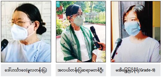 ဒီတစ်ခေါက်မှာ ကိုဗစ်ကာကွယ်ဆေး လည်း ထိုးထားတယ်ဆိုတော့ ရောဂါ ကူးစက်မှုကနည်းနည်း လျော့ကျသွားမယ် လို့ထင်ပါတယ်။ သမီးတို့က ပညာလိုလား သူတွေမို့ ကျောင်းကို မတက်မဖြစ်တက် ရမှာပဲ။ သမီးတို့ ကျောင်းပိတ်လိုက်တဲ့ အချိန်မှာ အတိုင်းအတာ တစ်ခုအထိ စာတွေ ပြတ်လပ်သွားခဲ့တယ်။ တချို့ဆို စိတ်ပျက်သွားတာမျိုးတွေ ဖြစ်နေကြ တယ်။ အဲဒါကြောင့် သမီးကတော့ ကျောင်းကို မဖြစ်မနေတက်တယ်။ သမီး စာတွေနဲ့ အဆက်မပြတ်ချင်ဘူး၊ ကျောင်း တွေ ပြန်ဖွင့်လိုက်တဲ့အတွက် ဆရာမတွေ၊ သူငယ်ချင်းတွေနဲ့ ပြန်တွေ့ပြီး ရင်းနှီးမှု တွေပြန်ရတဲ့အတွက် ဝမ်းသာပါတယ်။ အဲဒီအတွက် နိုင်ငံတော်အစိုးရကို အလွန် ကျေးဇူးတင်ပါတယ်ရှင့်။
