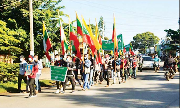 ထိုသို့ ဆန္ဒဖော်ထုတ်ရာတွင် “နိုင်ငံတော်စီမံအုပ်ချုပ်ရေးကောင်စီအား ထောက်ခံပါသည်၊ အမျိုးဘာသာ သာသနာကိုစောင့်ရှောက်သော မြန်မာ့တပ်မတော် အား ထောက်ခံပါသည်၊ NUG CRPH PDF အကြမ်းဖက်သမားအလိုမရှိ၊ NUG CRPH PDF အကြမ်းဖက်လုပ်ရပ်များအား ဆန့်ကျင်ကြ၊ ပြည်ထောင်စုမပြိုကွဲရေး ဒို့အရေး၊ တိုင်းရင်းသားစည်းလုံးညီညွတ်မှုမပြိုကွဲရေး ဒို့အရေး၊ အချုပ်အခြာအာဏာတည်တံ့ ခိုင်မြဲရေး ဒို့အရေး၊ ပြည်ပအားကိုး ပုဆိန်ရိုးများအား ဆန့်ကျင်ကြ၊ မြန်မာ့ပြည်တွင်း ရေး ပြည်ပဖြည့်စွက်မှုအလိုမရှိ၊ နိုင်ငံတော်စီမံအုပ်ချုပ်ရေးကောင်စီလုပ်ငန်းစဉ်(၅) ရပ်အား ထောက်ခံပါသည်၊ ဒီမိုကရေစီ အရေခြုံကွန်မြူနစ်လုပ်ရပ်ကျဆုံးပါစေ၊ NUG PDF အကြမ်းဖက်မှု အမြစ်ဖြတ်၊ NUG PDF အကြမ်းဖက်မှုတွေ မြင်အောင်ကြည့်၊ NUG PDF ရဲ့ ပြည်သူ့အပေါ် အကြမ်းဖက်မှုချက်ချင်းရပ် ’’ စသည့် စာသားပါ ဆိုင်းဘုတ်များ ကိုင်ဆောင်ကြွေးကြော်ခဲ့ကြကြောင်း သတင်းရရှိသည်။