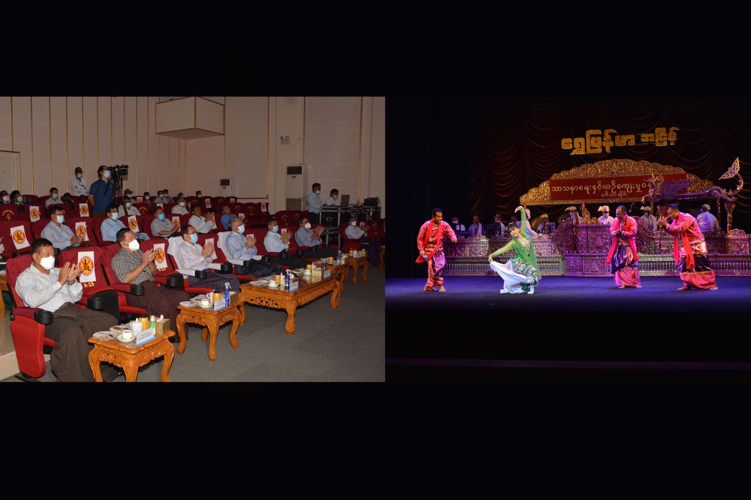 သာသနာရေးနှင့်ယဉ်ကျေးမှုဝန်ကြီးဌာနသည် ရိုးရာယဉ်ကျေးမှု အနုသုခုမအမွေအနှစ်များကို ရှာဖွေခြင်း၊ ဖော်ထုတ်ထိန်းသိမ်းခြင်းနှင့် တိုးတက်ပြန့်ပွားစေရန် ဆောင်ရွက်ခြင်းစသည့် လုပ်ငန်း တာဝန်များကို ဆောင်ရွက်လျက်ရှိပြီး ကိုဗစ် 19 ကာလအတွင်း အများပြည်သူများ စိတ်အပန်းပြေ စေရေးအတွက် မြန်မာ့ရိုးရာယဉ်ကျေးမှုများကို အခြေခံသည့် ဖျော်ဖြေရေး အစီအစဉ်များကို ဖော်ထုတ်ပြသရန် ရည်ရွယ်၍ နေပြည်တော်ရှိ အနုပညာဦးစီးဌာန လေ့ကျင့်ရေး ဇာတ်ရုံ၌ “ရွှေမြန်မာ” အငြိမ့်ခန်းအစီအစဉ်(၂)ကို ဇာတ်တိုက်လေ့ကျင့်လျက်ရှိရာ သာသနာရေးနှင့်ယဉ်ကျေးမှု ဝန်ကြီးဌာန ပြည်ထောင်စုဝန်ကြီး ဦးကိုကို၊ ရင်းနှီးမြှုပ်နှံမှုနှင့် နိုင်ငံခြားစီးပွားဆက်သွယ်ရေးဝန်ကြီး ဌာန ပြည်ထောင်စုဝန်ကြီး ဦးအောင်နိုင်ဦးတို့သည် ဒုတိယဝန်ကြီးများ ဖြစ်ကြသော ဦးအေးထွန်း၊ ဦးထွန်းအုံ တို့နှင့်အတူ ယနေ့နံနက်ပိုင်းတွင် ကြည့်ရှုစစ်ဆေးသည်။