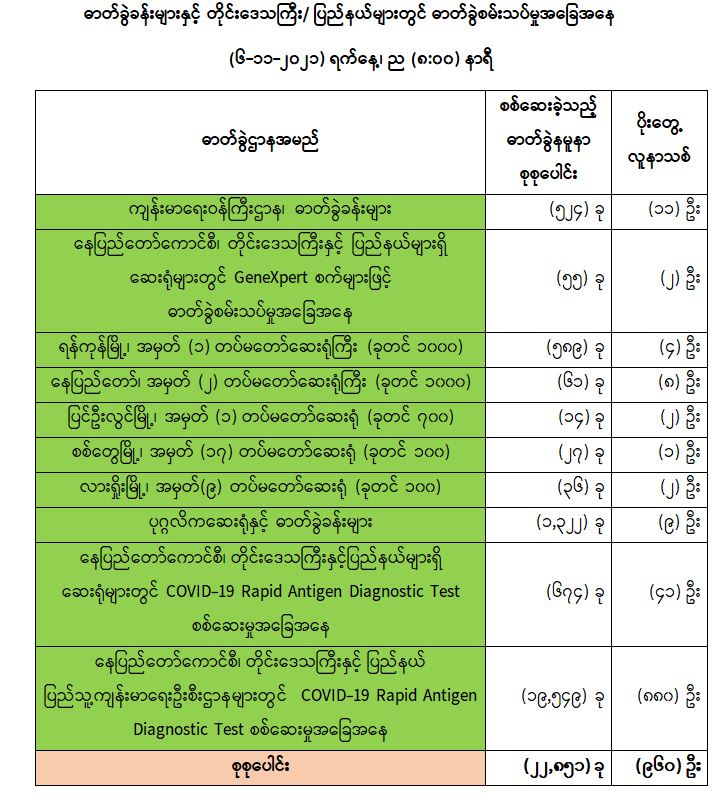 သို့ဖြစ်ပါ၍ ယနေ့အထိ ဓာတ်ခွဲနမူနာစုစုပေါင်း (၅,၀၀၈,၀၄၆)ခုအား စစ်ဆေးခဲ့ပြီး COVID-19 ဓာတ်ခွဲ အတည်ပြုလူနာ စုစုပေါင်း (၅၀၅,၉၉၈) ဦး ရှိပြီ ဖြစ်ပါသည်။