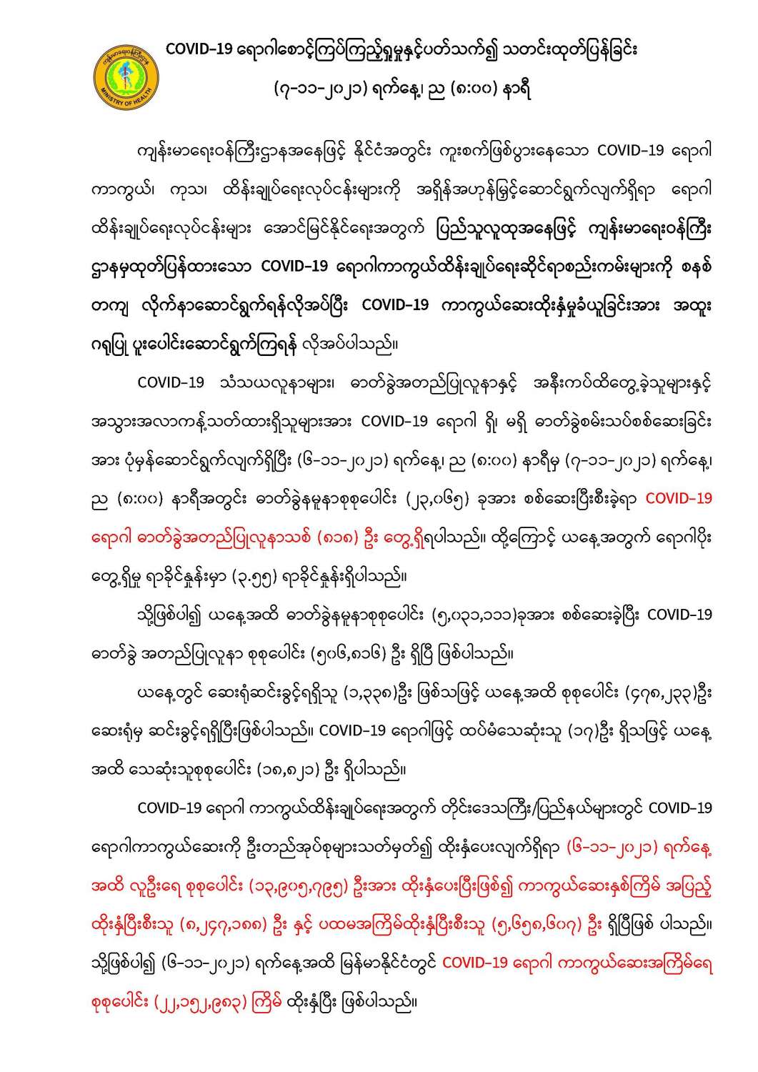 COVID-19 ရောဂါစောင့်ကြပ်ကြည့်ရှုမှုနှင့်ပတ်သက်၍ သတင်းထုတ်ပြန်ခြင်း