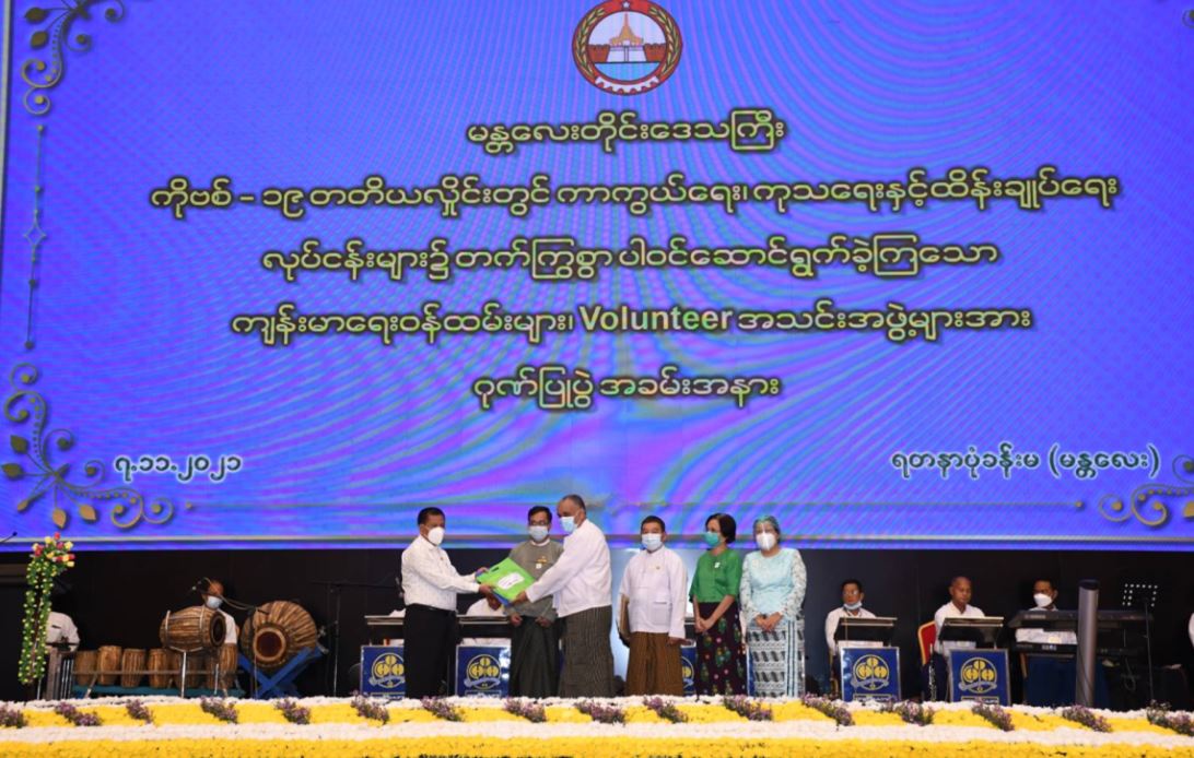 မန္တလေးတိုင်းဒေသကြီးအတွင်း ကိုဗစ်-၁၉ ရောဂါ ကာကွယ်၊ ထိန်းချုပ်၊ ကုသရေး လုပ်ငန်းများတွင် တတ်ကြွစွာပါဝင်ခဲ့သော ကျန်းမာရေးဝန်ထမ်းများ၊ တပ်မတော်သားများနှင့် စေတနာ့ဝန်ထမ်းများအား ဂုဏ်ပြုပွဲကို ယနေ့ညနေပိုင်းတွင် မန္တလေးတိုင်းဒေသကြိး၊ မဟာအောင်မြေမြိုနယ်၊ ရတနာပုံခန်းမ၌ ပြုလုပ်ရာ မန္တလေးတိုင်းဒေသကြီး ဝန်ကြီးချုပ် ဦးမောင်ကို၊ အလယ်ပိုင်းတိုင်းစစ်ဌာနချုပ် တိုင်းမှူး ဗိုလ်ချုပ် ကိုကိုဦး၊ ဌာနဆိုင်ရာ တာဝန် ရှိသူများနှင့် စေတနာ့ဝန်ထမ်းများ တက်ရောက်ကြသည်။