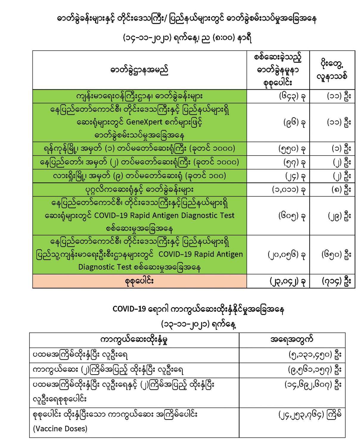 COVID-19 ရောဂါ ကာကွယ်ထိန်းချုပ်ရေးအတွက် တိုင်းဒေသကြီး/ပြည်နယ်များတွင် COVID-19 ရောဂါကာကွယ်ဆေးကို ဦးတည်အုပ်စုများသတ်မှတ်၍ ထိုးနှံပေးလျက်ရှိရာ (၁၃-၁၁-၂၀၂၁) ရက်နေ့ အထိ လူဦးရေ စုစုပေါင်း (၁၄,၆၉၂,၆၀၇) ဦးအား ထိုးနှံပေးပြီးဖြစ်၍ ကာကွယ်ဆေးနှစ်ကြိမ် အပြည့် ထိုးနှံပြီးစီးသူ (၉,၅၆၁,၁၅၇) ဦး နှင့် ပထမအကြိမ်ထိုးနှံပြီးစီးသူ (၅,၁၃၁,၄၅၀) ဦး ရှိပြီဖြစ် ပါသည်။ သို့ဖြစ်ပါ၍ (၁၃-၁၁-၂၀၂၁) ရက်နေ့အထိ မြန်မာနိုင်ငံတွင် COVID-19 ရောဂါ ကာကွယ်ဆေးအကြိမ်ရေ စုစုပေါင်း (၂၄,၂၅၃,၇၆၄) ကြိမ် ထိုးနှံပြီး ဖြစ်ပါသည်။