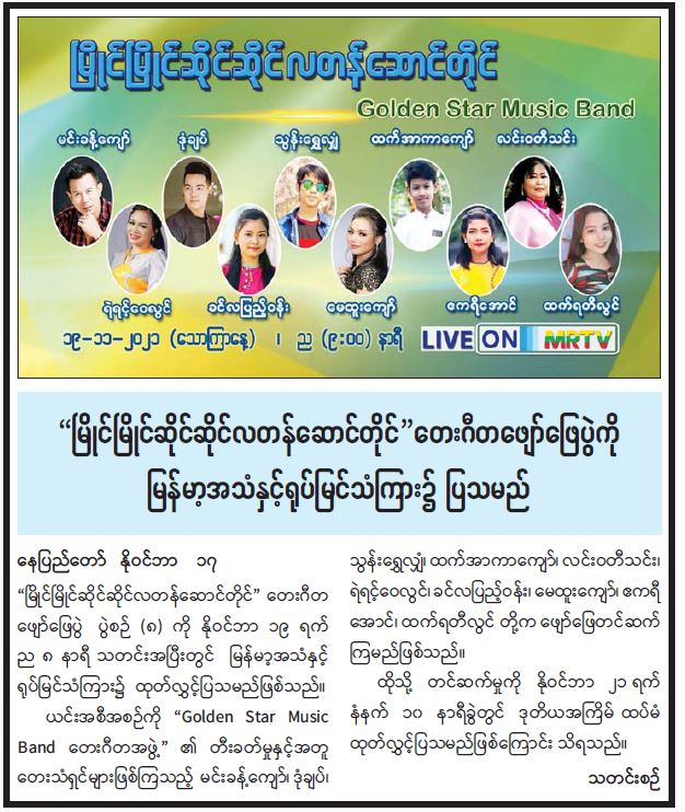 မြိုင်မြိုင်ဆိုင်ဆိုင်လတန်ဆောင်တိုင် တေးဂီတဖျော်ဖြေပွဲကို မြန်မာ့အသံနှင့်ရုပ်မြင်သံကြား၌ ပြသမည်