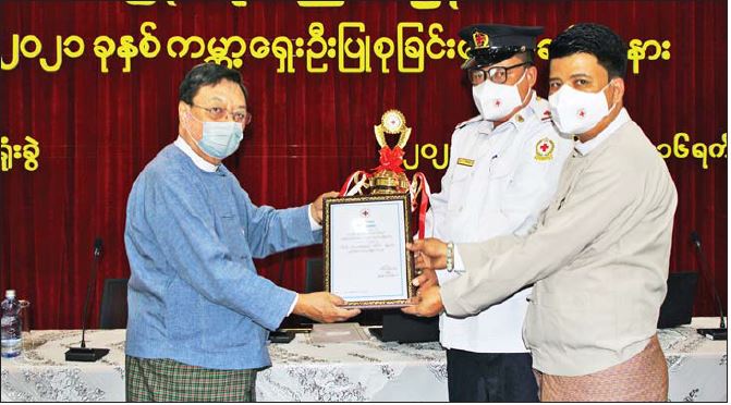 ထို့နောက် ရှေးဦးပြုစုခြင်းဆိုင်ရာလုပ်ငန်းများတွင် ထူးချွန်ဆုရရှိသူများအား ဆုများချီးမြှင့်ရာ ရှေးဦးပြုစုခြင်း(နည်းပြ)သင်တန်းများ ဖွင့်လှစ်နိုင် အကောင်အထည်ဖော်ဆောင်ရွက်နိုင်သည့် ဆုတစ် ဆု၊ ရှေးဦးပြုစုခြင်း စွမ်းစွမ်းတမံဆောင်ရွက်နိုင် သည့် မြို့နယ်နှစ်မြို့နယ်၊ ရှေးဦးပြုစုခြင်း သင်တန်း များ အကြိမ်ရေအများဆုံး ဖွင့်လှစ်နိုင်သည့် မြို့နယ်သုံးမြို့နယ်နှင့် ရှေးဦးပြုစုခြင်းဖြင့် ကူညီဆောင်ရွက် ပေးနိုင်သည့် ကြက်ခြေနီစေတနာ လုပ်အားရှင် ၂၂ ဦးတို့အား ဆုများနှင့် ဂုဏ်ပြုမှတ်တမ်းလွှာများ ပေးအပ်ချီးမြှင့်ခဲ့ကြသည်။